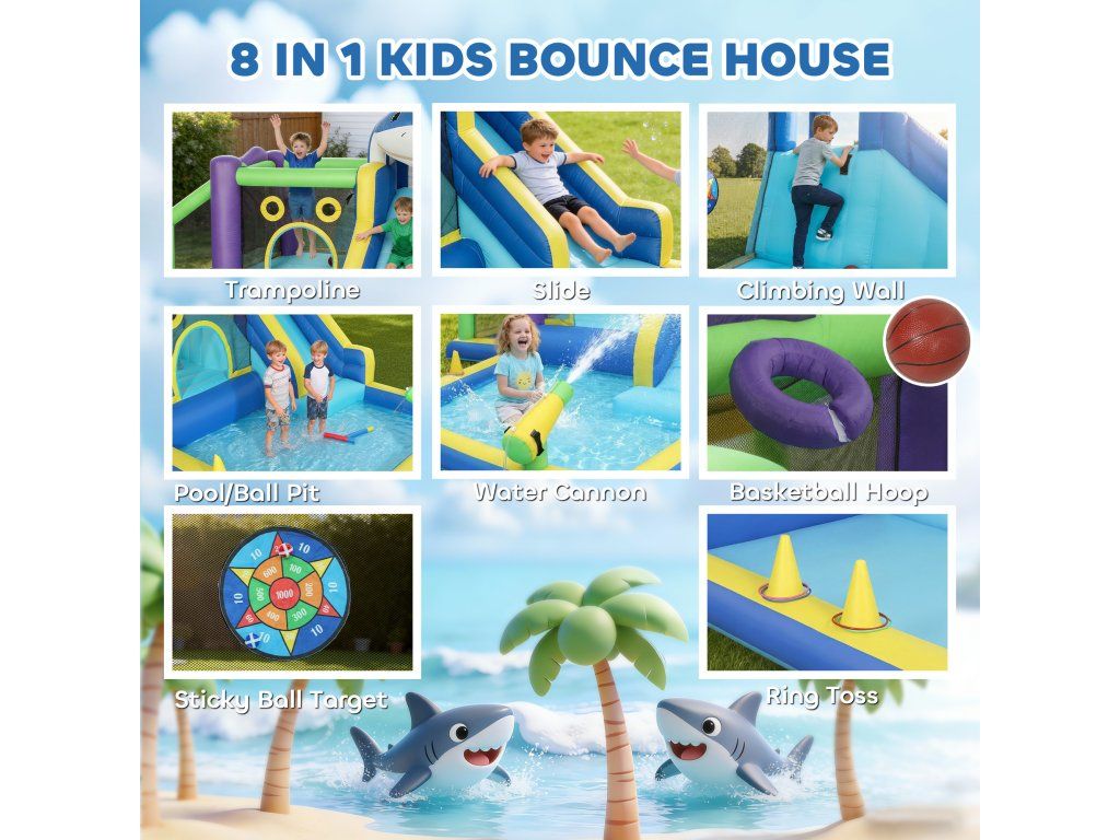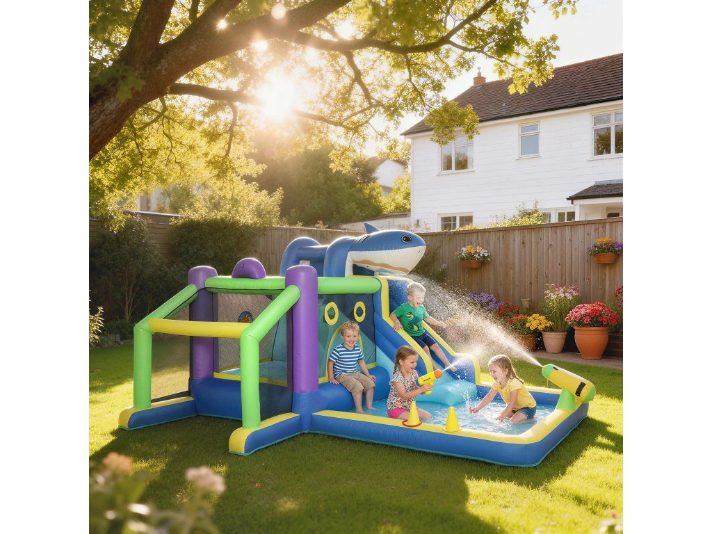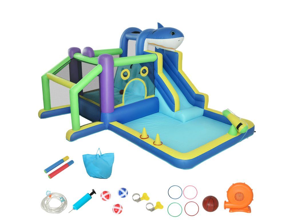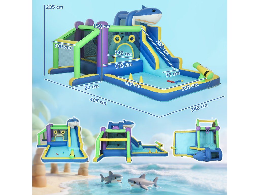 Nafukovací skákací hrad AIYAPLAY 8 v 1 se žraločím motivem, fukarem, skluzavkou, brouzdalištěm a trampolínou pro děti 3-8 let, 405x345x235cm, vícebarevný