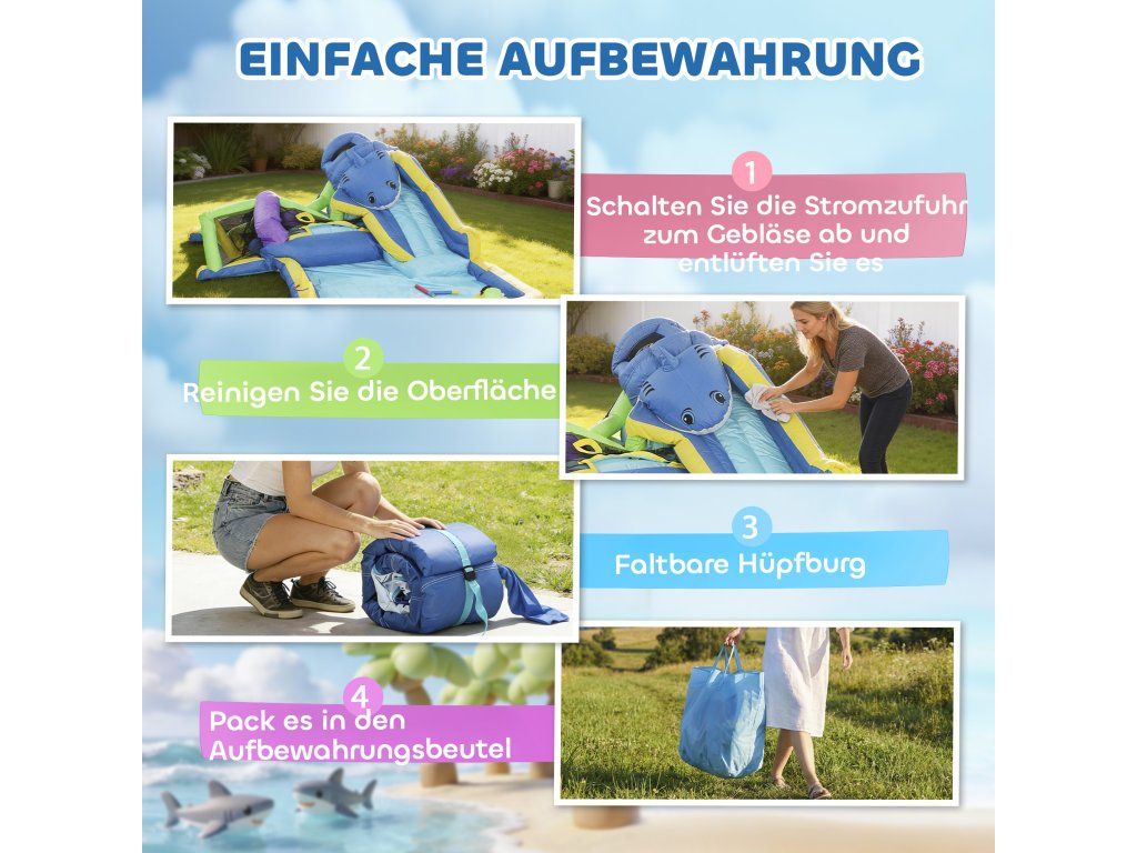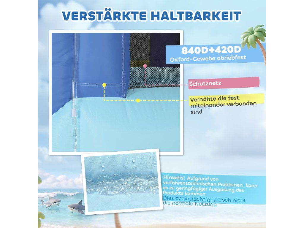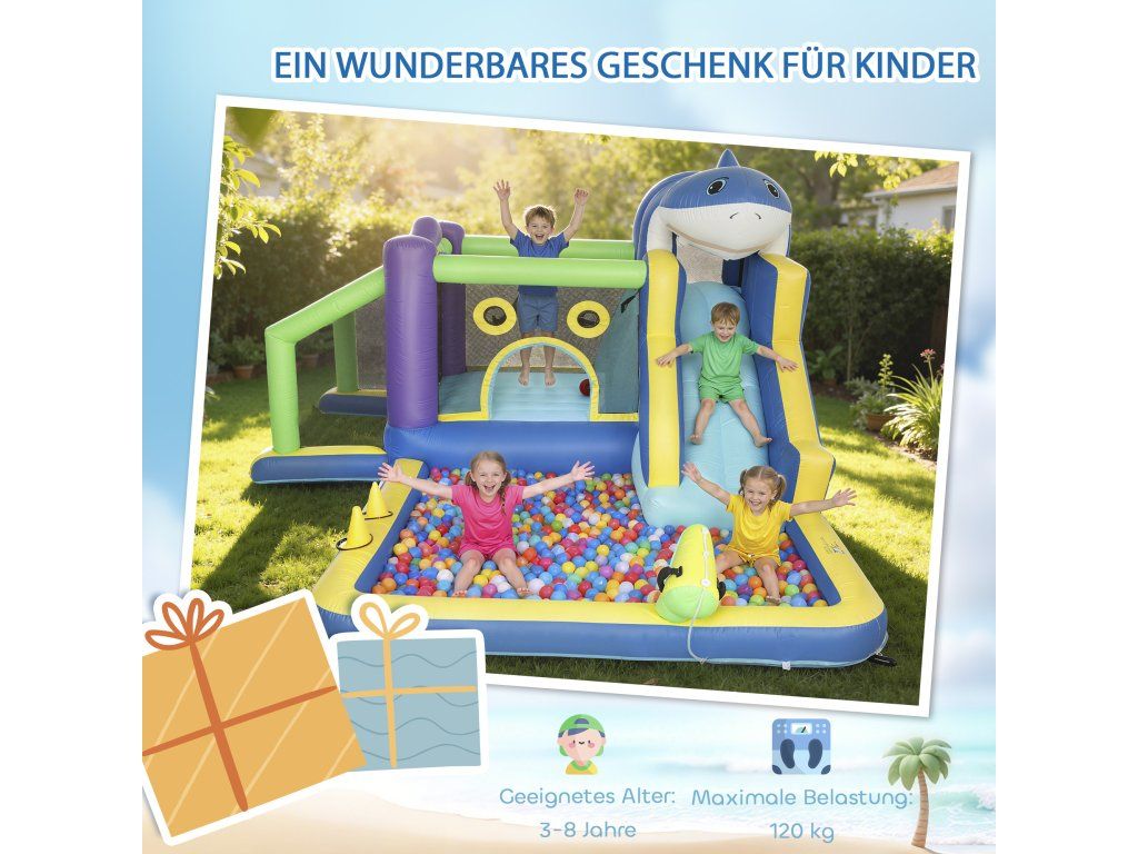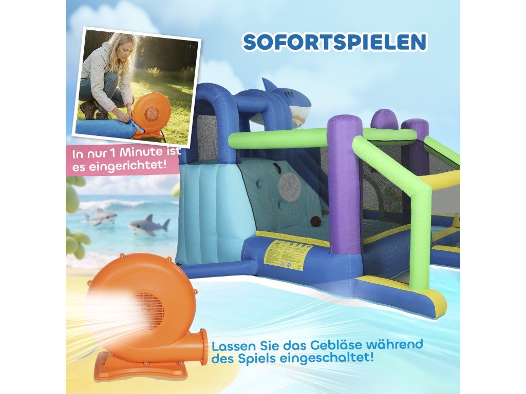 Nafukovací skákací hrad AIYAPLAY 8 v 1 se žraločím motivem, fukarem, skluzavkou, brouzdalištěm a trampolínou pro děti 3-8 let, 405x345x235cm, vícebarevný