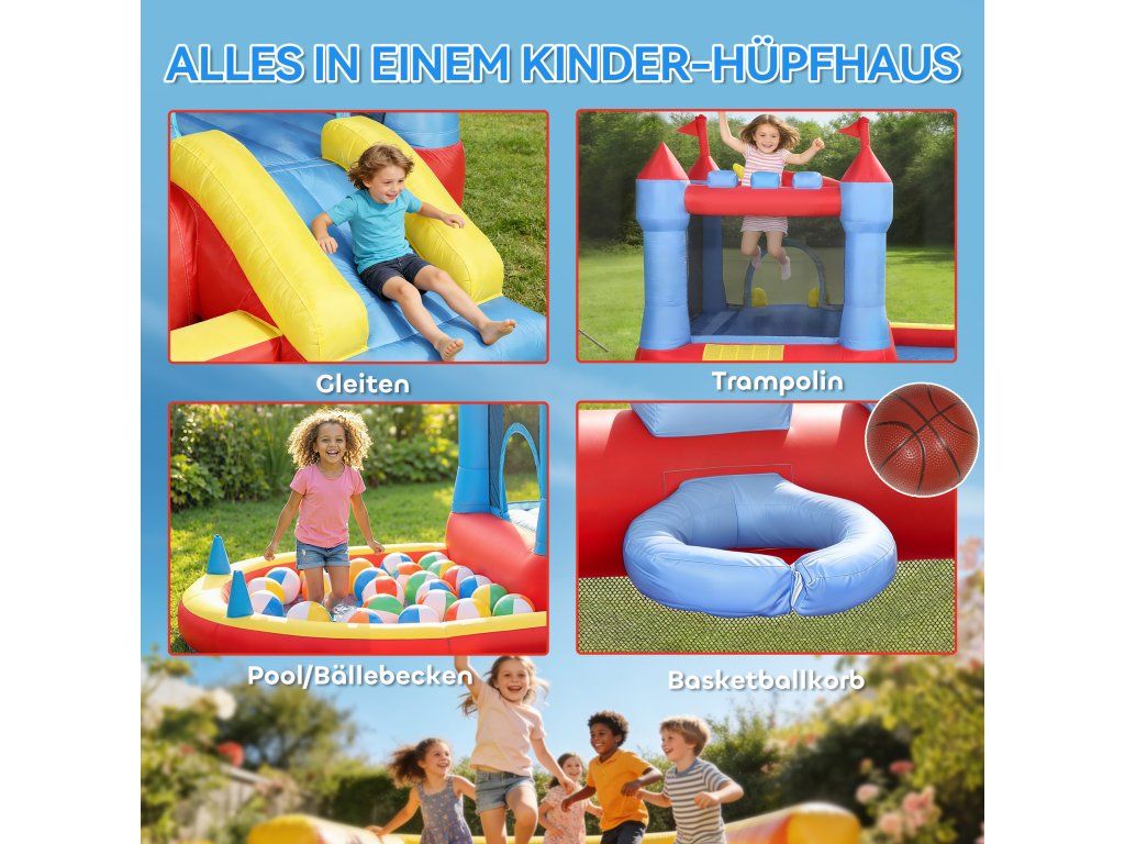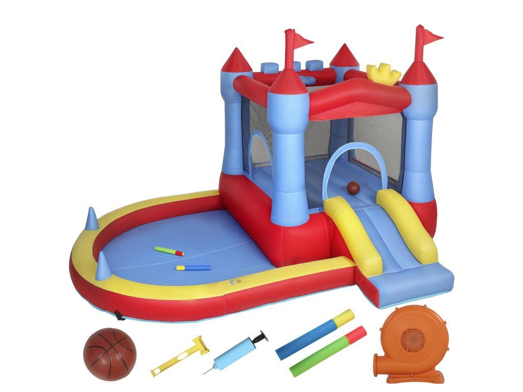 ✔ Tento dětský skákací hrad kombinuje trampolínu, skluzavku, brouzdaliště a basketbalový koš pro nekonečnou aktivní zábavu.