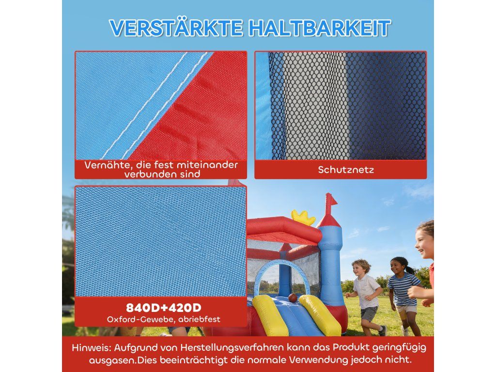 ✔ Odolná oxfordská tkanina 840D a síťovina zajišťují dlouhodobé a spolehlivé používání tohoto skákacího hradu.