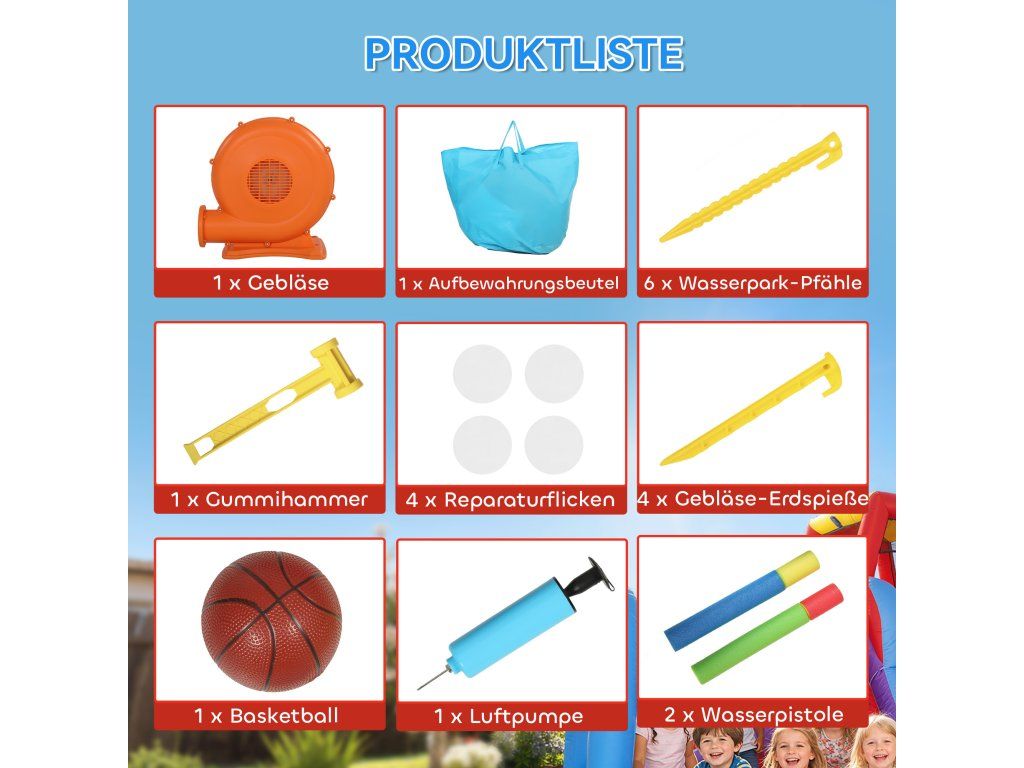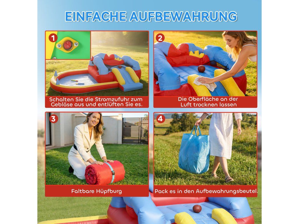 Kompletní sada příslušenství: Sada obsahuje zemní kotvy, úložný vak, kladivo, ruční pumpu, míč, vodní trysku a záplaty na opravu. Díky tomu je nastavení a údržba mnohem snazší. Skákací hrad lze také kompaktně uložit do přepravní tašky.