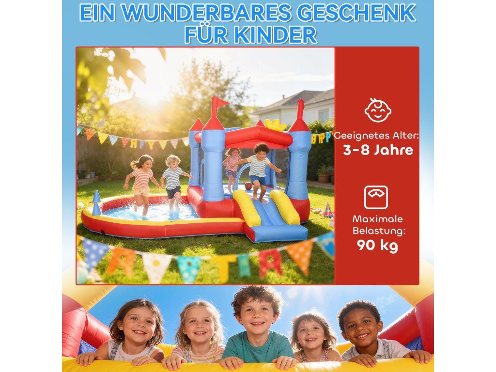 Hrajte si kdekoli: Tento nafukovací hrad je ideální na zahradu nebo na setkání v parku a promění jakýkoli venkovní prostor v mini zábavní park. Dětem poskytne hodiny zábavy – ideální pro narozeninové oslavy, oslavy svátků nebo relaxační víkendy.