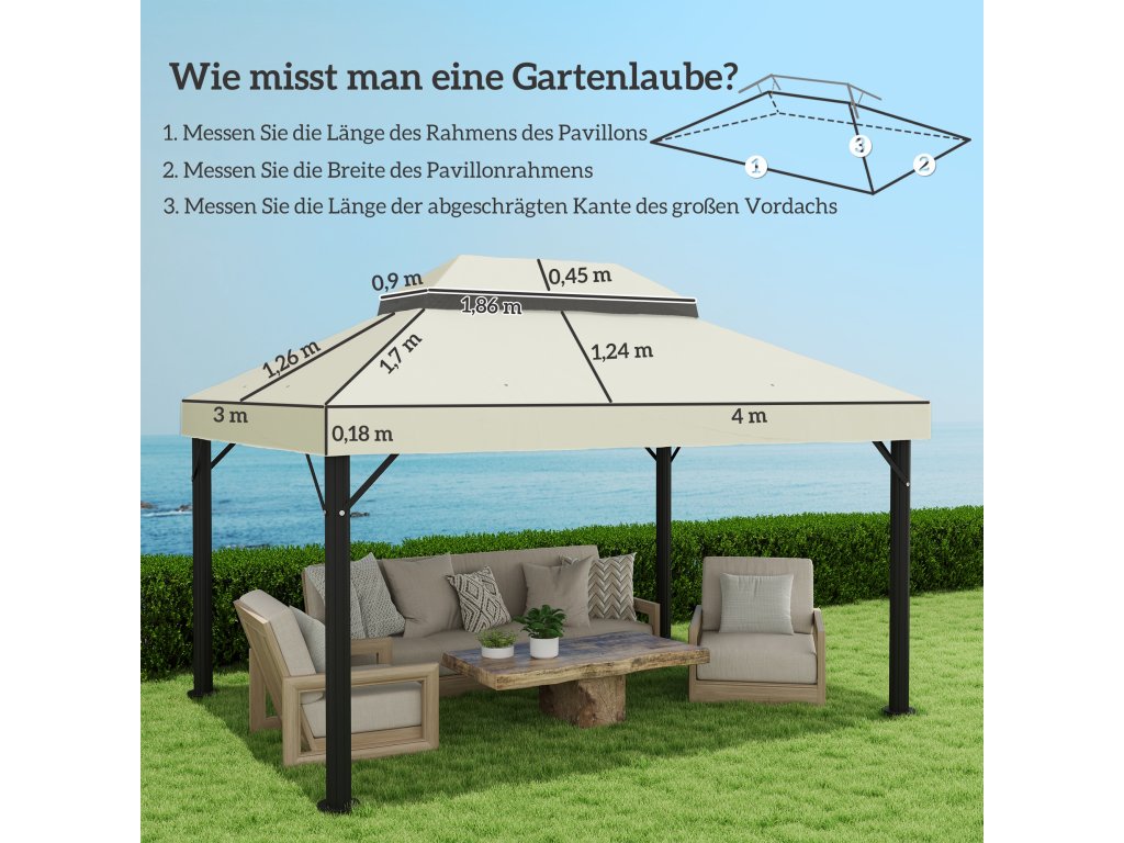 - Optimalizujte svůj altán: Oživte svůj venkovní prostor pomocí naší náhradní stříšky, která byla speciálně vyvinuta pro altány 3 x 4 m s dvoupatrovou střechou, a vdechněte svému rámu altánu nový život. Pozorně si prohlédněte obrázek s rozměry výrobku a změřte si rám svého altánu, abyste se ujistili, že vám dobře padne!