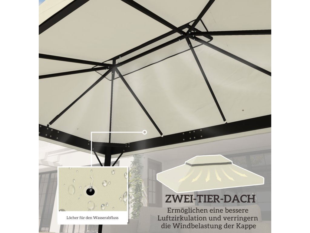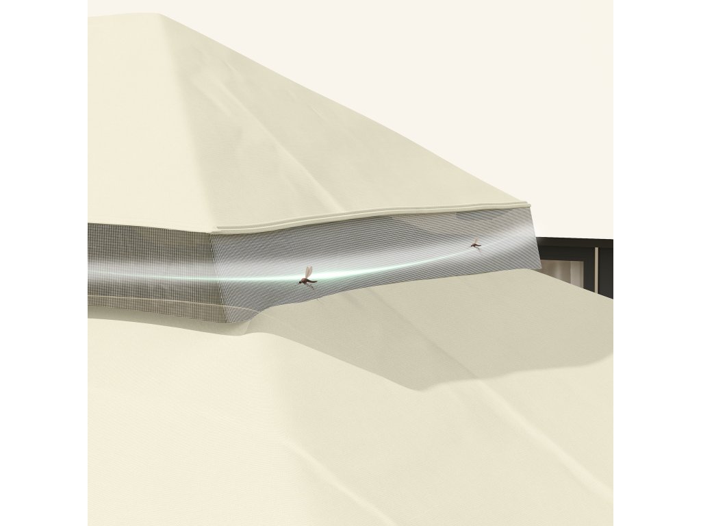 - Dvouúrovňová střecha: Dvouúrovňová konstrukce střechy pavilonu nejen dobře vypadá, ale také zlepšuje větrání vašeho pavilonu a stabilitu při větru. V otvorech střechy je síť, která zabraňuje přístupu hmyzu