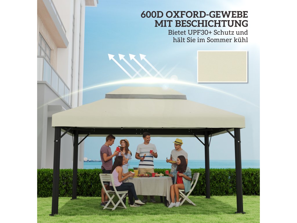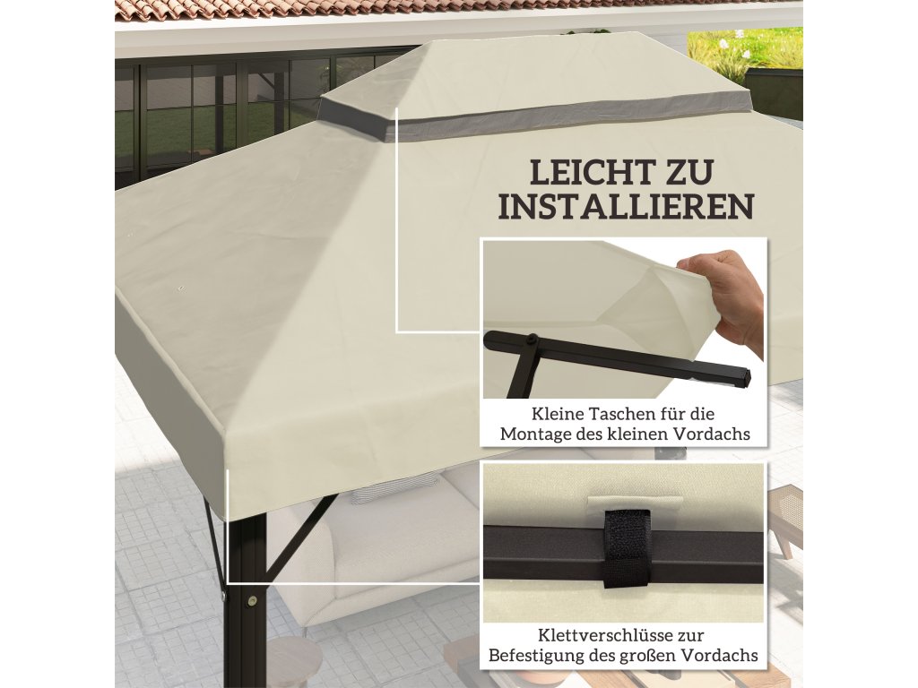 Vdechněte svému altánu nový život s náhradní střechou pro altán Outsunny. Je vyrobena z odolného polyesteru a chrání vás před slunečními paprsky. Dvoupatrová střecha altánu podporuje účinnou cirkulaci vzduchu a stabilizuje altán při větrném počasí. Díky otvorům pro odvod dešťové vody ve střeše pavilonu se voda nehromadí. Užijte si teplé dny venku v příjemném stínu.