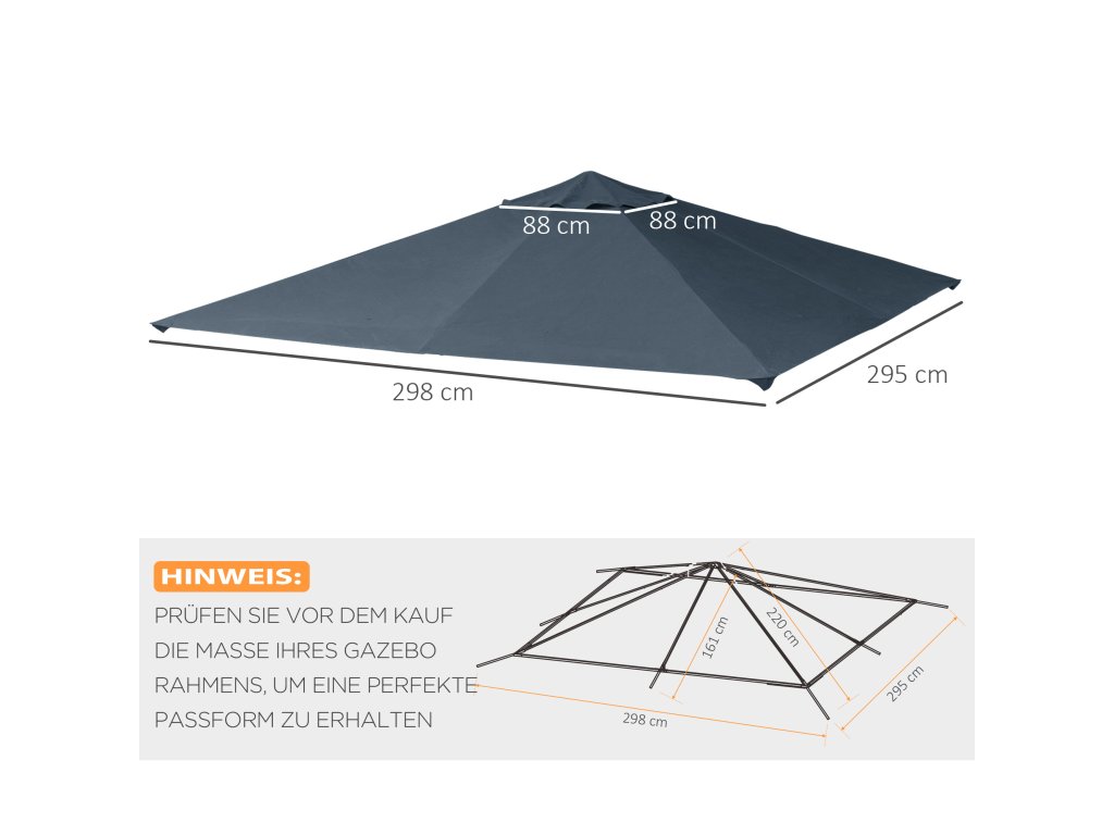 - VYSOCE KVALITNÍ NÁHRADNÍ STŘECHA: Tato střecha altánu je vhodná pro zahradní altán se základnou o rozměrech L295-300 x B295-300 cm. POZNÁMKA: Kupujte ji pouze v případě, že znáte velikost svého altánu. Jedná se pouze o střechu altánu, rám není součástí balení.
