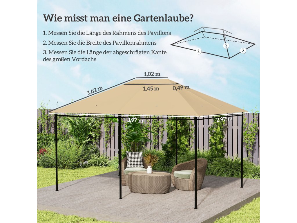 - Celkové rozměry náhradní střechy altánu: 397L x 297W cm. Vhodné pro altán o rozměrech 4 x 3 m. Před nákupem si prosím ověřte velikost a model svého altánu. Vyvarujte se stání pod ním za deštivého počasí.