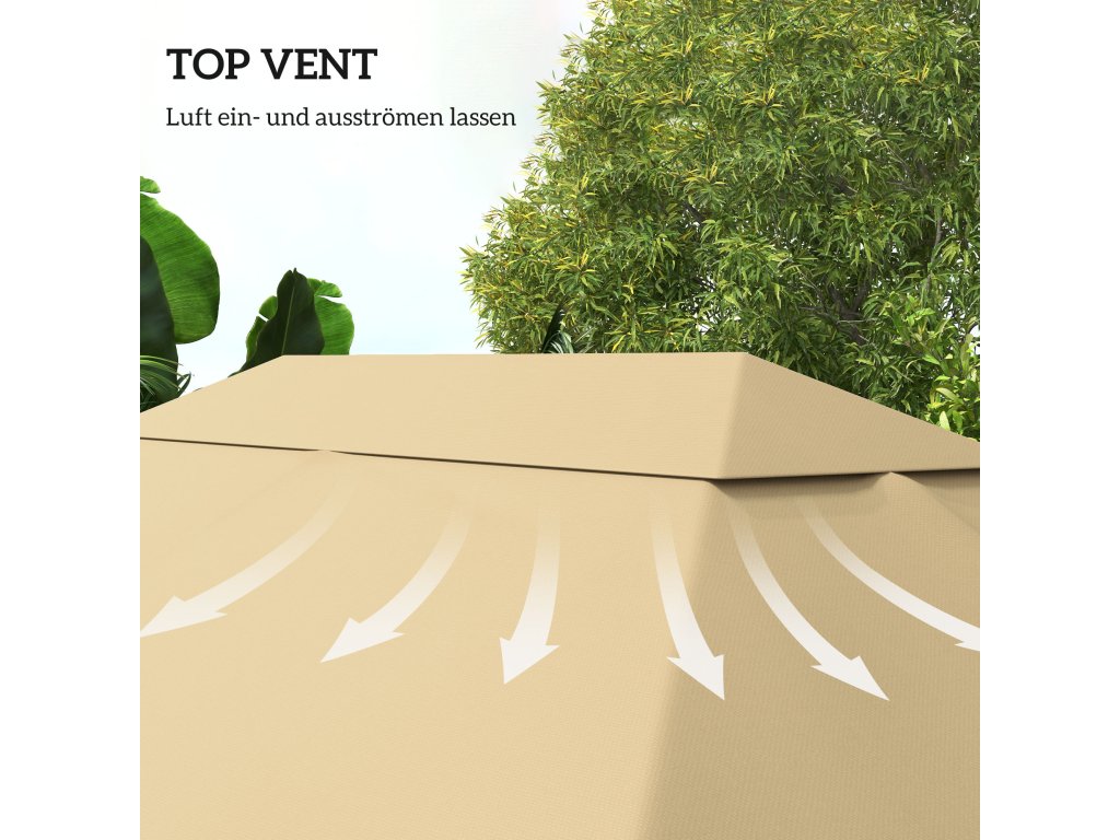 - Horní větrací otvor: Umožňuje vstup a výstup vzduchu z náhradní stříšky altánu, čímž poskytuje vašemu altánu vynikající ventilaci a stabilitu proti větru