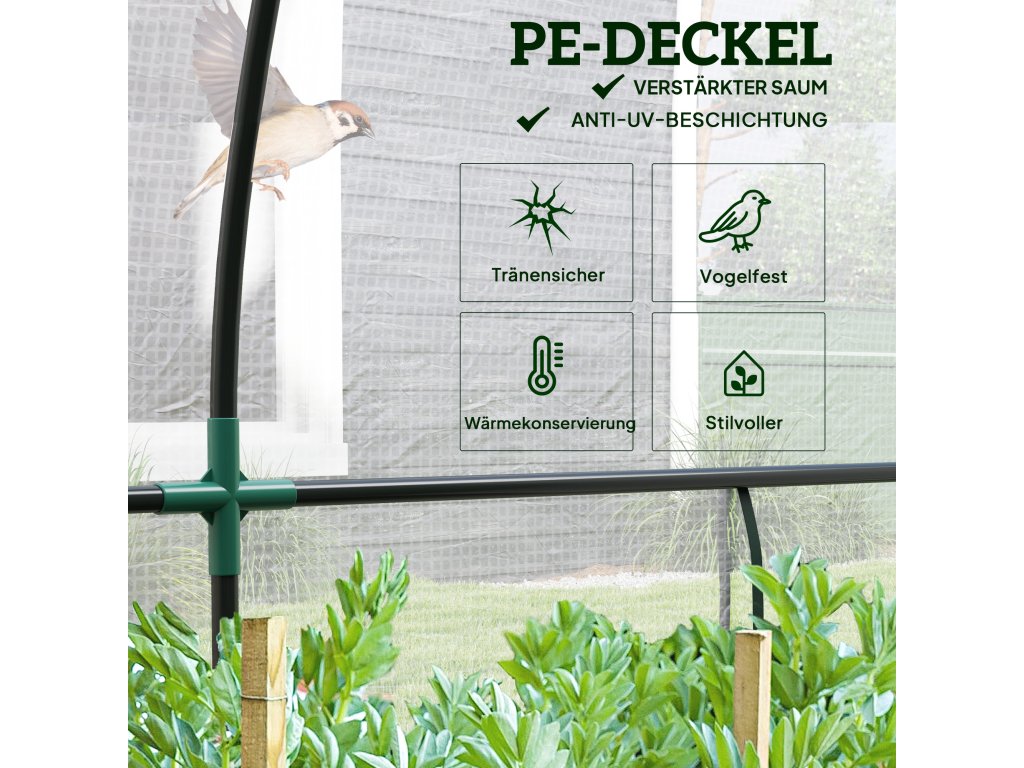 - Plastový kryt odolný proti UV záření: Chrání rostliny před poškozením UV zářením a zároveň umožňuje průchod 85 % výživného slunečního světla. Skleník je také trvanlivý a odolný vůči stárnutí. Se zesíleným okrajem švů, který zabraňuje vzniku prasklin