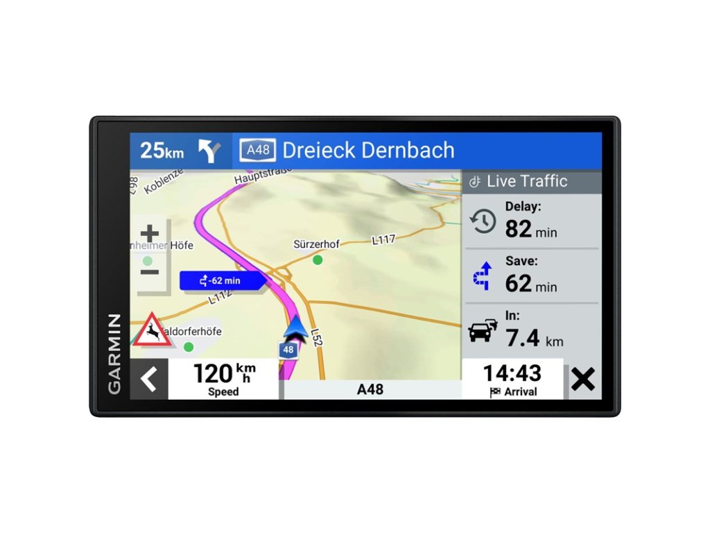 Po spárování navigace s kompatibilním telefonem s aplikací Garmin Drive™ je navigace schopna získávat informace o aktuální dopravě a předpovědi počasí.