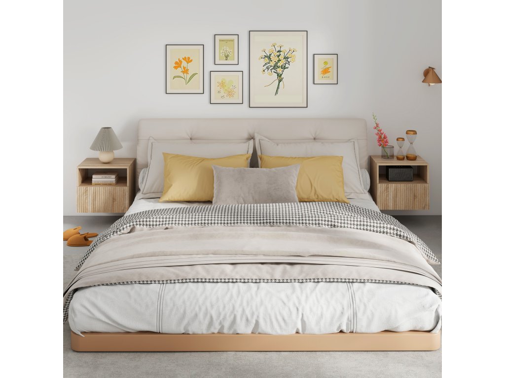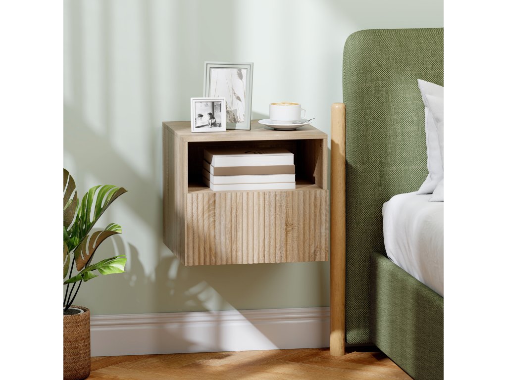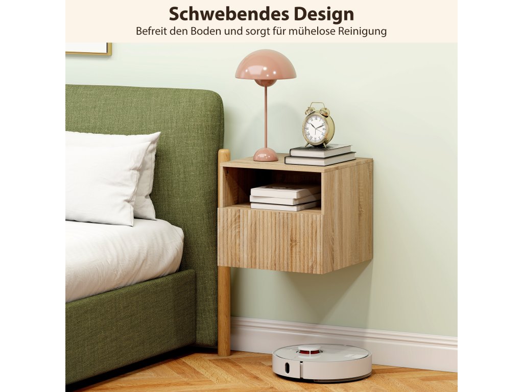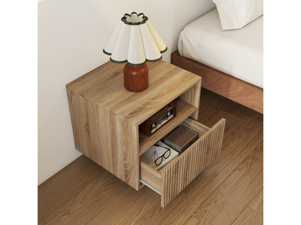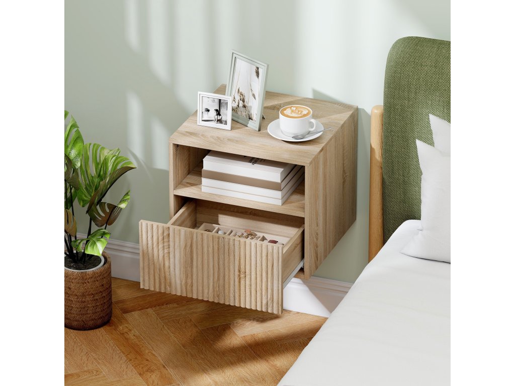 - Plovoucí konstrukce: Montáží nočního stolku na stěnu se uvolní místo na podlaze, takže malé ložnice působí světle a otevřeně a váš robotický vysavač pod nimi může snadno vysávat.