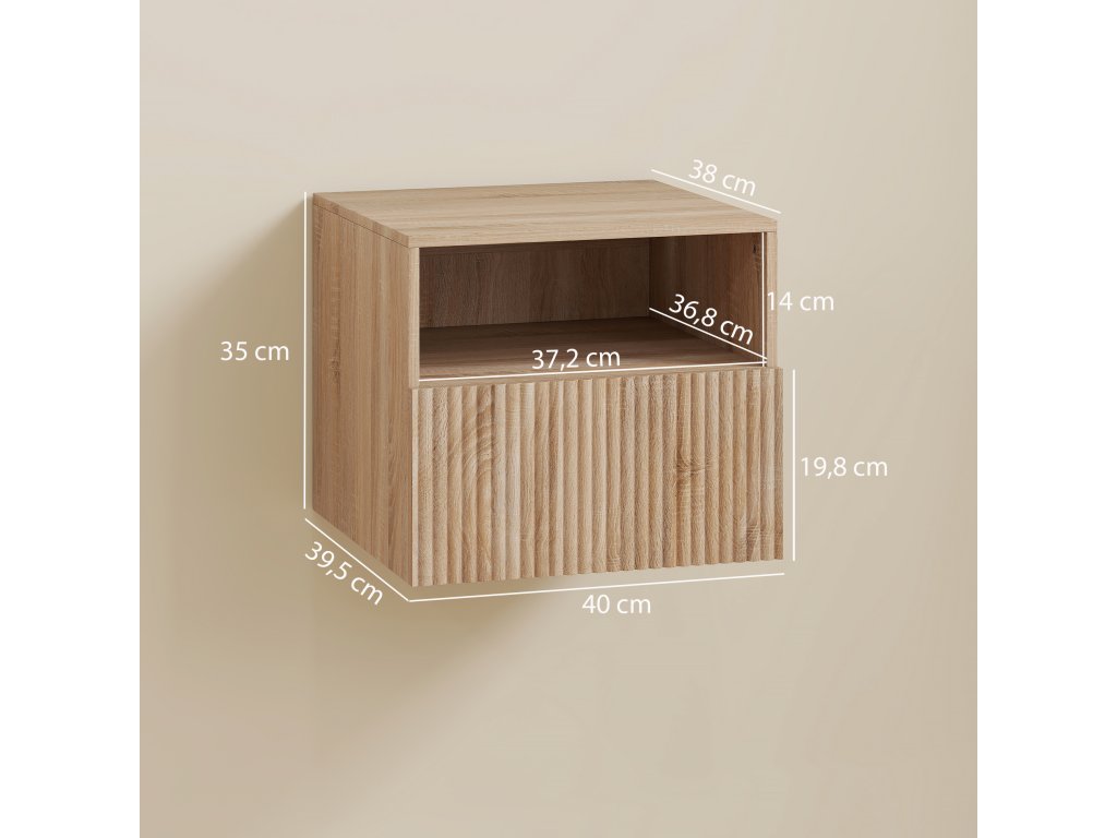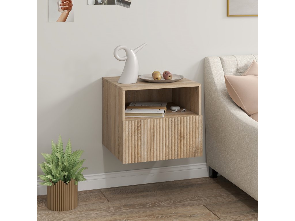 Trápí vás stísněná ložnice a přeplněný noční stolek? Vizuální nepořádek může rušit váš klid a pohodu. Plovoucí noční stolek HOMCOM přináší úlevu a prostor. Díky elegantní harmonikové zásuvce a otevřenému odkládacímu prostoru na knihy a nápoje promění vaši ložnici v klidnou oázu bez nepořádku.