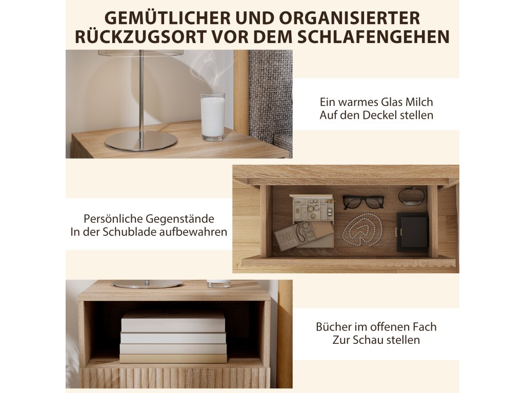 - Moderní severská elegance: Drážkovaná čela zásuvek bez úchytek a v přírodním vzhledu dřeva nočního stolku vnesou do vašeho pokoje stylový, moderní nádech a každý den vytvoří příjemnou atmosféru.