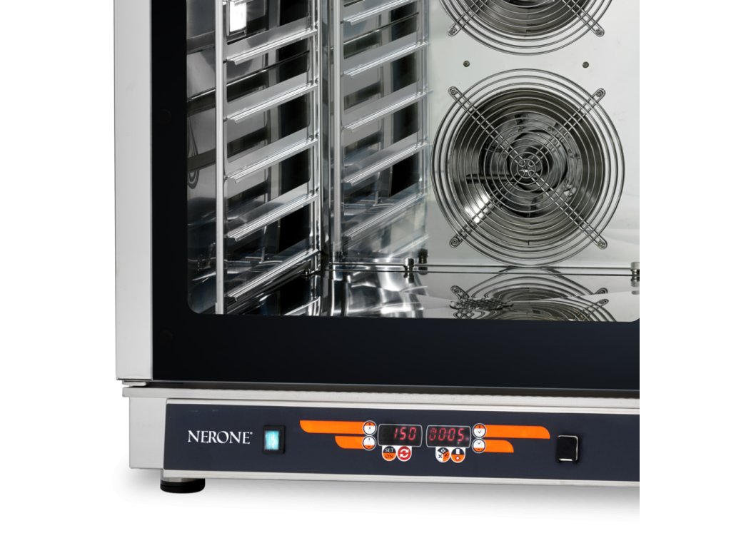 Digitální konvekční (horkovzdušná) pec s přivlhčováním a regulací páry 10 až 100 %. Díky páře nedochází k vysoušení produktů, je zachována jejich šťavnatost. U pečení pečiva má pára vliv na rovnoměrnou strukturu a následně jeho kvalitu. V sérii NORDline Nerone MID je počet roštů (600 x 400 mm) nebo GN 1/1 dán číslem v názvu za "MID". Rošty ani GN nejsou součástí. Pod troubu je možné pořídit také podstavec z nerezové oceli s protiskluzovými nožkami a zásuvy na rošty nebo plechy.vývin páry s nástřikem, regulace páry 10 až 100 %, kombinovaný režim (kombinace pečení a páry), napojení na vodovodní řád a odpad, ventilátor s opačným systémem proudění vzduchu, dokonalý ventilační systém – rovnoměrná distribuce tepla, teplotní sonda, delta T pečení, nerezové opláštění a vnitřek trouby + masivní rukojeť, dvojité prosklené dveře, snadná údržba a čištění - lehce vyměnitelné tesnění, vyjímatelné vnitřní lišty, zaoblené vnitřní hrany, zámkový systém, vnitřní osvětlení, digitální ovládání, termostat 280 °C, spolehlivost garantována evropskou výrobou, kapacita 6 x GN 1/1 nebo rošt 600 x 400 mm (nejsou součástí ceny), vzdálenost mezi rošty - 80 mm