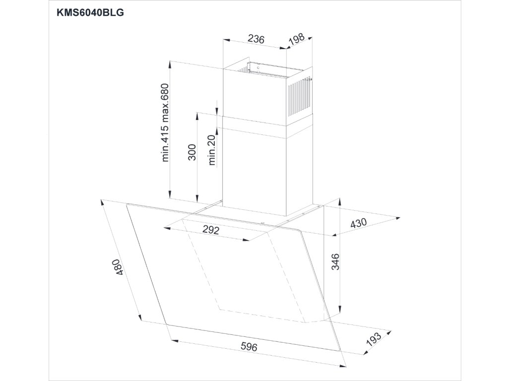 Dekorativní komínový odsavač par v provedení s černým čelním sklem, šířka 60 cm, 1 motor/1 ventilátor, dotykové ovládání na skle, 3 stupně výkonu, výkon odtahu 335 - 580 m3/h, hlučnost 57-68 dB(A), roční spotřeba energie 53,4 kWh/a, energetická třída B (energetický štítek B,B,A,F), osvětlení LED pásek, tukový filtr (typ ALU, 8 vrstev) omyvatelný v myčce nádobí (součást balení), filtry z aktivního uhlíku režim recirkulace: 2x FR-7944 (závitový na motor, není součástí balení), rozměry (V x Š x H): 480 x 596 x 430 mm, výška s komínem: 761 - 1026 mm