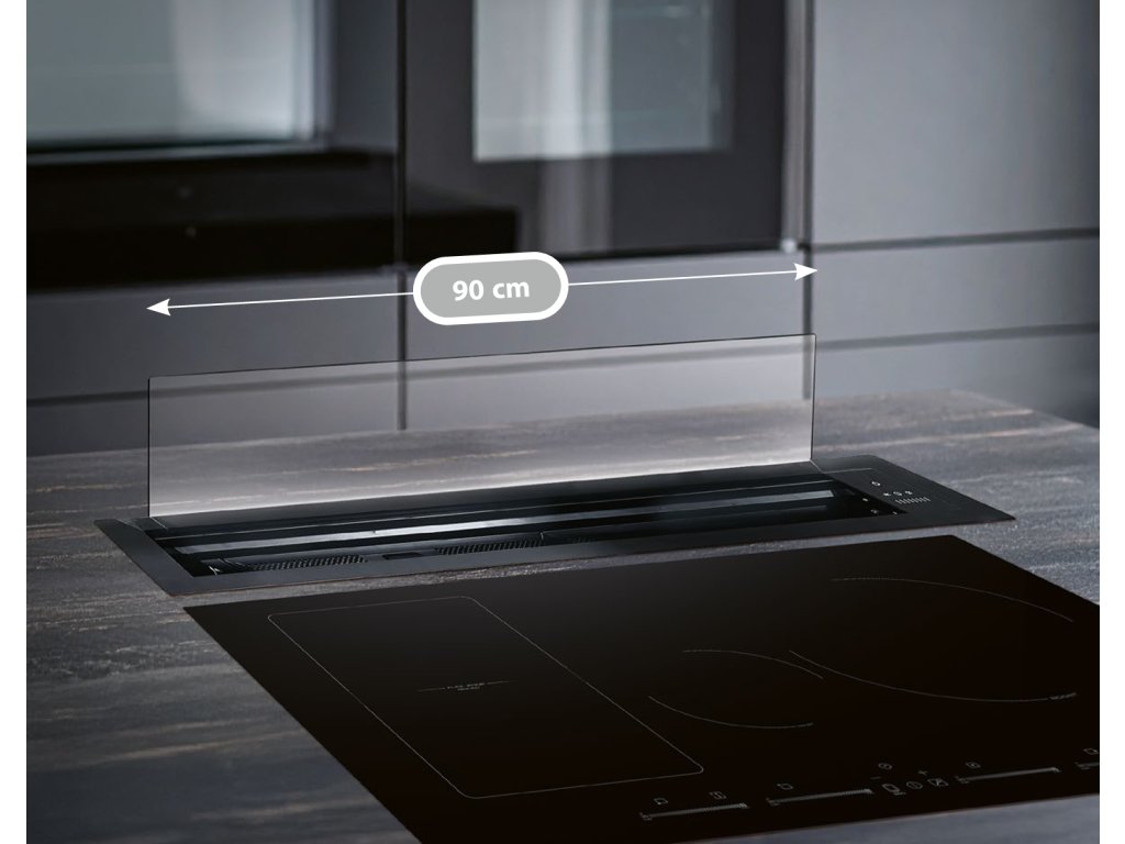 Odsavač par Kluge KLD9500BLG s šířkou 90 cm s výsuvným panelem z čirého skla a instalací přímo do pracovní desky; Moderní design a černé barevné provedení s kombinací nerezové oceli a čirého a černého skla; Ovládání dotykové a podsvícené, s osmi úrovněmi rychlosti a speciálním režimem Boost; Tento režim se po 5 minutách automaticky vrátí na úroveň 8; Osvětlení 6 W umožňuje nastavení barvy světla; Barvu světla lze nastavit v šesti variantách: Bílá, Červená, Zelená, Modrá, Žlutá, Fialová, Oranžová, Zelenožlutá; Funkce odloženého vypnutí s výchozím nastavením na 5 minuty; Výkon odtahu: 302,8 – 629,4 m³/h (696 m³/h v režimu Boost); Hlučnost: 50 – 66 dB(A) (72 dB(A) v režimu Boost); Tukový filtr je 5-vrstvý hliníkový a je vhodný pro mytí v myčce; Ochrana proti přivření; Provoz je možný v režimu recirkulace s použitím uhlíkového filtru A1.4739; Třída energetické účinnosti A+; Roční spotřeba energie je pouhých 26,8 kWh/rok; Rozměry (ŠxHxV): 86,8 x 23 x 55,2 cm