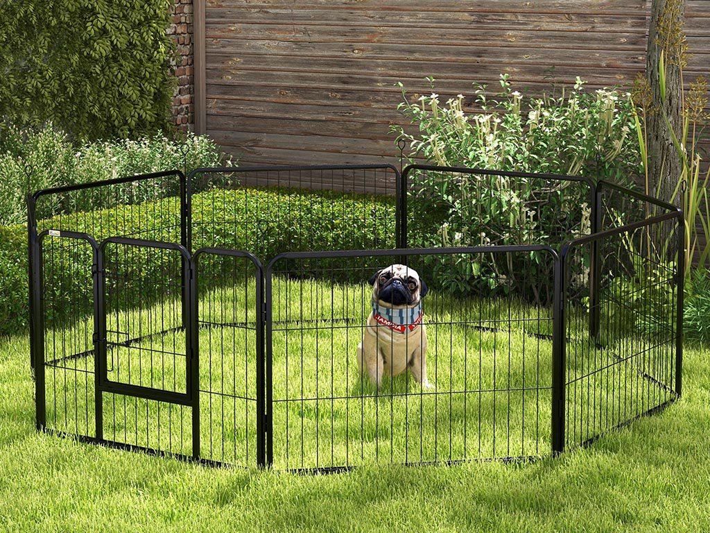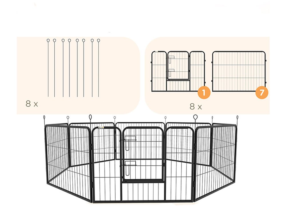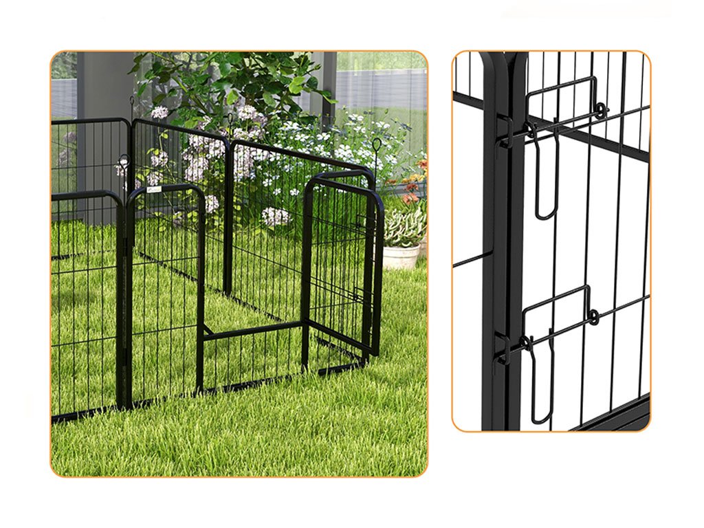 Ohrádka pro štěňata a další zvířata, stabilní odolná konstrukce, uzamykatelná dvířka, pro venkovní i vnitřní využití, 8 mřížkových panelů, rozměry panelu 80 x 60 cm.