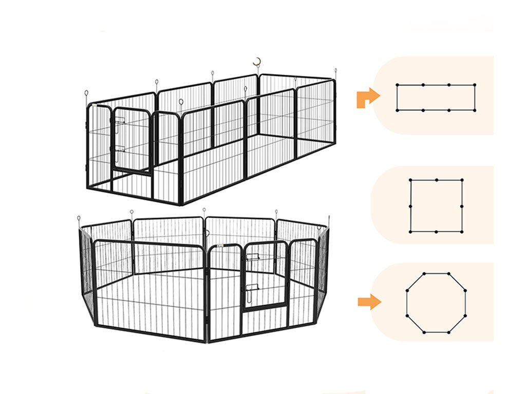 Výběh poskytuje bezpečné prostředí a zamezuje situacím jako je útěk na ulici nebo kontakt s jedovatými rostlinami či nebezpečnými předměty. Pokud budete výběh používat vevnitř, může Váš domov chránit před možným poškozením Vašeho vybavení (kousání nábytku, škrábání). Výběh je ideální pro výcvik základních povelů, vytyčený prostor pomáhá štěňatům soustředit se a snižuje rušivé vlivy. Lze jej vybavit pohodlnými pelíšky, hračkami a vodou s jídlem, což zajistí komfort a potřeby Vašich chlupáčů. Jsou snadno sestavitelné a přenosné, můžete výběh použít jak na zahradě, tak uvnitř domu podle potřeby. Umožňuje postupné zvykání zvířat na nové prostředí a lidi, což je důležité pro jejich socializaci a celkové chování. Do výběhu snadno projdete přes otevírací dvířka, která jsou ve výšce 17,5 cm, aby malá zvířata nemohla při otevření dvířek uniknout.