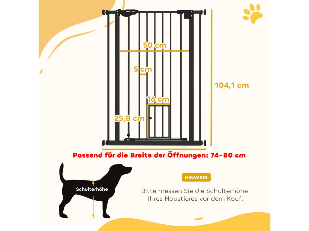 - Údaje o výrobku schodišťové branky: 104 cm extra vysoká konstrukce, domácí zvířata ji obtížně přeskočí. Tato zábrana pro domácí zvířata je ideální pro dveře, chodby, schody atd. Celkové rozměry: 68 x 104,1 cm. Naše zábrana je vhodná pouze pro otvory od 74 do 80 cm, před nákupem si prosím změřte svůj otvor. Je nutná montáž.