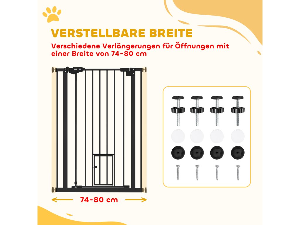 S brankou PawHut pro psy snadno udržíte své domácí mazlíčky mimo určité oblasti. Je vyrobena z pevné oceli a nabízí maximální stabilitu a odolnost. Díky 4 nastavitelným šroubům se flexibilně přizpůsobí šířce od 74 cm do 80 cm, a je proto ideální pro různé velikosti místností. Udržujte svůj domov v bezpečí a pořádku - jednoduše a efektivně.