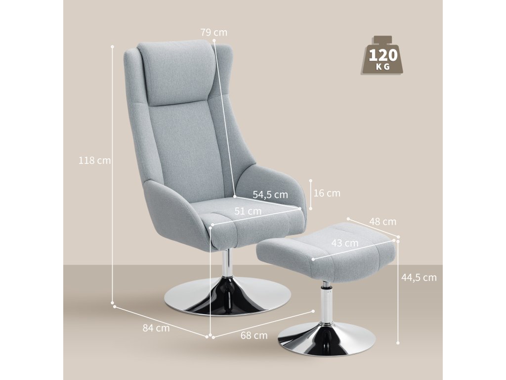 Informace o produktu: Celkové rozměry: Židle: 68Š x 84H x 118V cm. Podnožka: 43Š x 48H x 44,5V cm. Nosnost: 120 kg. Montáž trvá pouhých 15 minut.