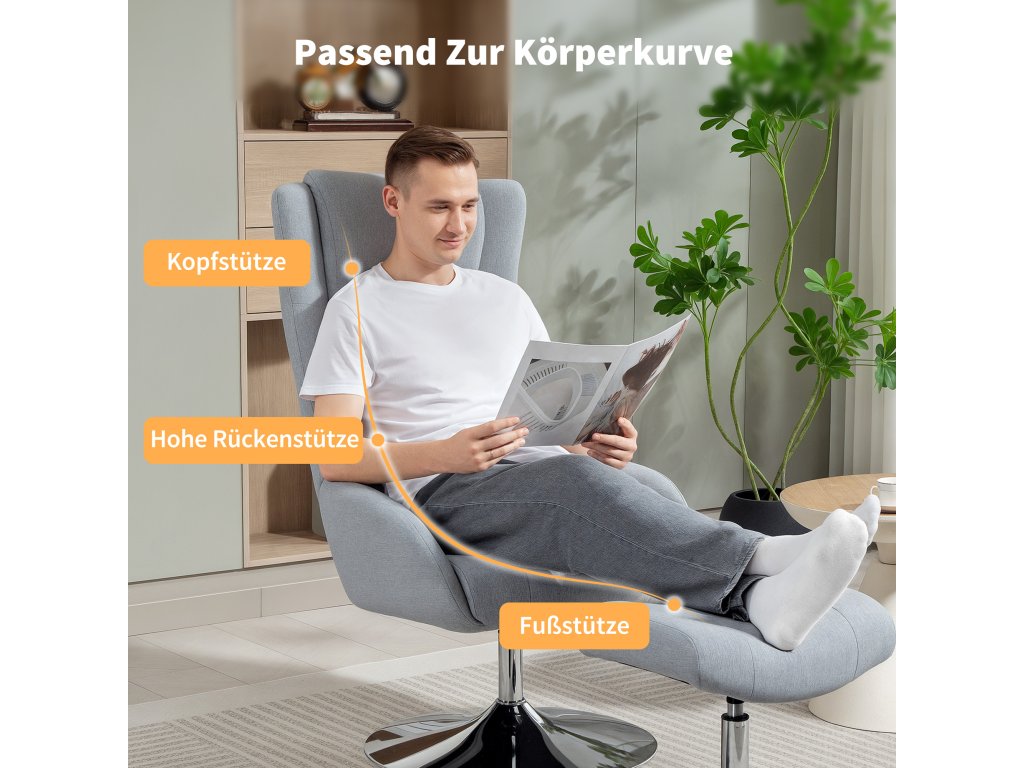 Ergonomická opora: Opřete se, opřete si hlavu o polstrovanou opěrku hlavy a natáhněte nohy na podnožku – toto polohovací křeslo přirozeně a pohodlně podpírá vaše tělo.
