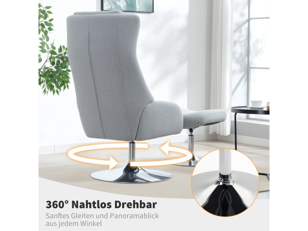 Pohodlí otáčení o 360°: Křeslo v obývacím pokoji i podnožka nabízejí plynulé otáčení o 360°, což vám umožní bez námahy se otáčet, ať už pro konverzaci, změnu výhledu nebo si výhled užívat.