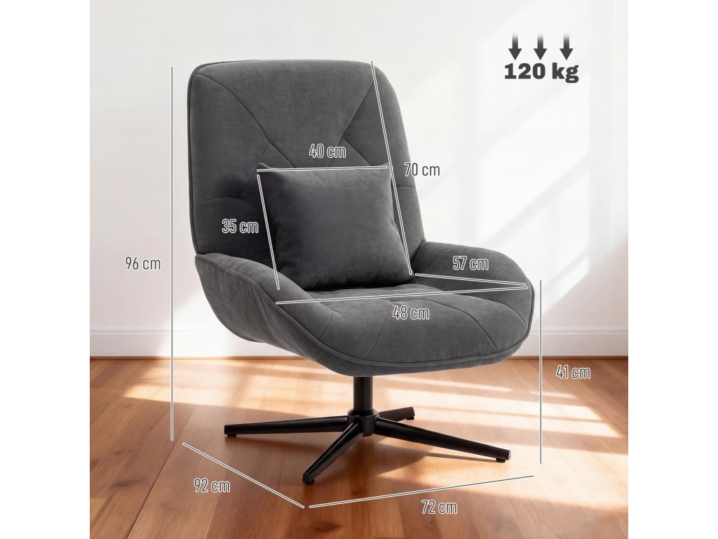 Zažijte maximální pohodlí s křeslem HOMCOM: 10cm pěnový sedák s taštičkovými pružinami poskytuje pohodlnou oporu, zatímco vysoké opěradlo obepíná vaše tělo. Měkká žinylková látka křesla dodá vašemu obývacímu pokoji nebo ložnici útulný nádech. Díky funkci otáčení o 360° se můžete pohybovat bez námahy a robustní kovová křížová základna zajišťuje spolehlivou stabilitu při relaxaci. ... Popis: