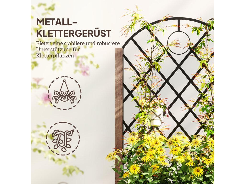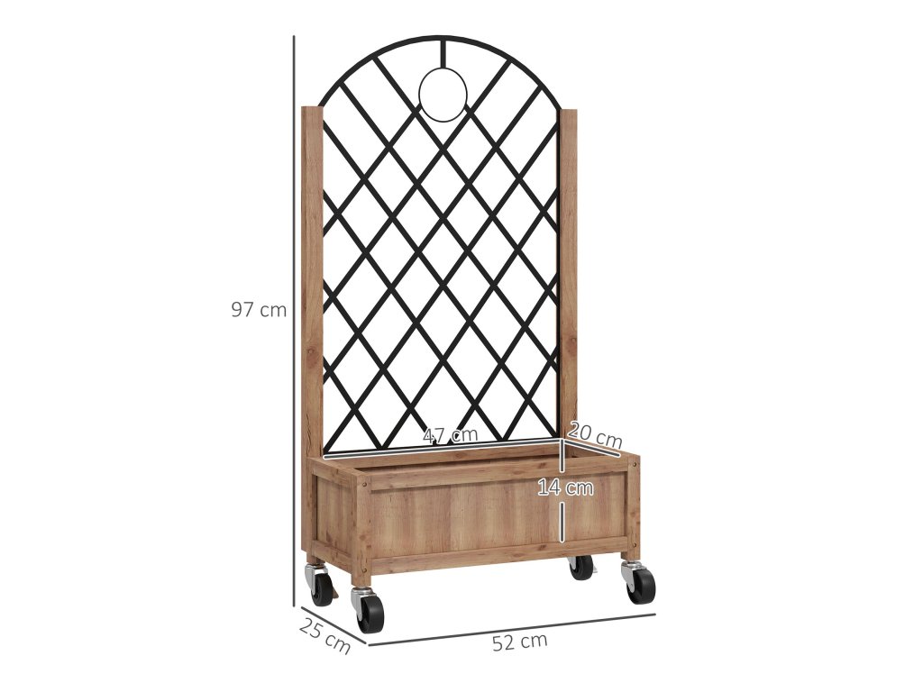 Přetvořte si zahradu s vyvýšenými záhony Outsunny! Robustní kovová diamantová mřížka dřevěného vyvýšeného záhonu optimálně podporuje růst vašich rostlin a drenážní otvory zabraňují zamokření. Snadno přemístěte květináč na požadované místo a zajistěte ho pro stabilní a kvetoucí krásu. Ideální pro barevný záhon nebo zelený popínavý květináč!