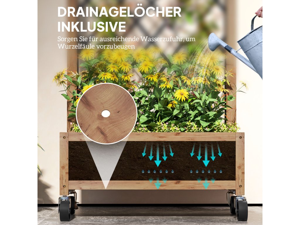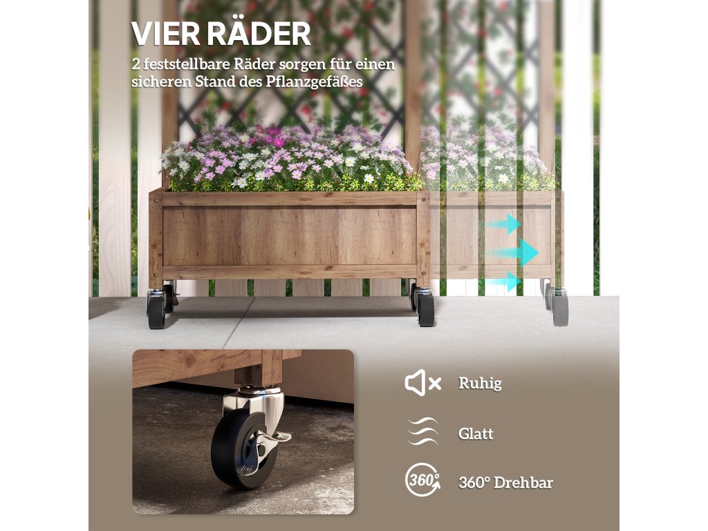 Snadná mobilita a stabilita: Snadno přemisťujte svou zahradu! Náš vyvýšený záhon s treláží je vybaven čtyřmi univerzálními, hladce se pohybujícími kolečky, z nichž dvě jsou aretovatelná, pro stabilní umístění a snadné přemisťování.