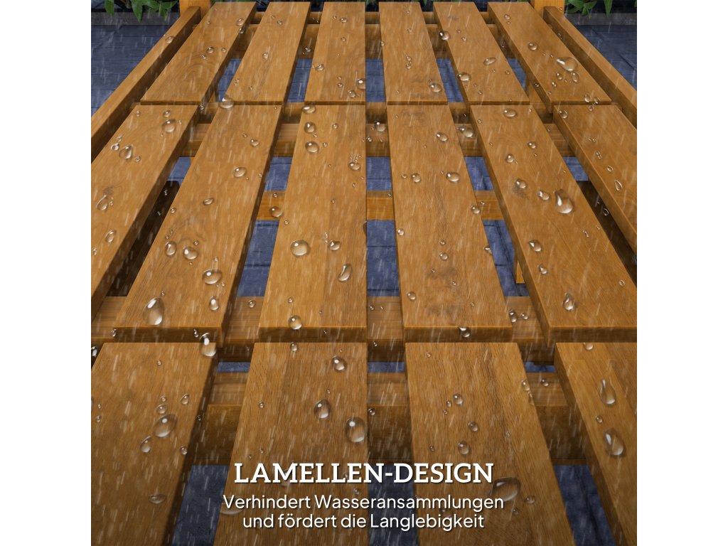 - Tělo z akátového dřeva: Dřevěná lavička je vyrobena z robustního akátového dřeva, které odolává opotřebení, zachovává si svůj tvar a zabraňuje deformaci, čímž zajišťuje dlouhodobé používání. Lamelová konstrukce zajišťuje rychlý odtok vody.