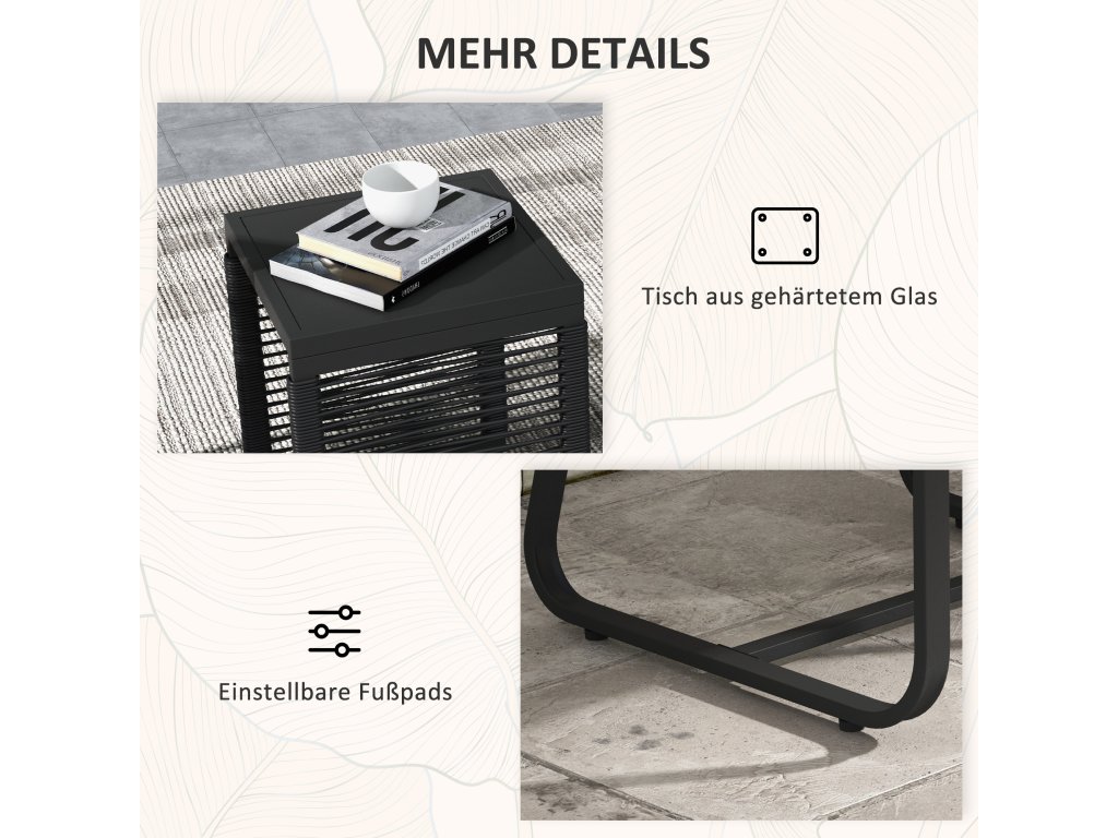 Elegantní a praktické: Deska stolu z tvrzeného skla dodává sadě nádech sofistikovanosti. Nabízí praktický povrch pro nápoje, občerstvení nebo dekorace. Zdařilou kombinací stylu a funkčnosti.