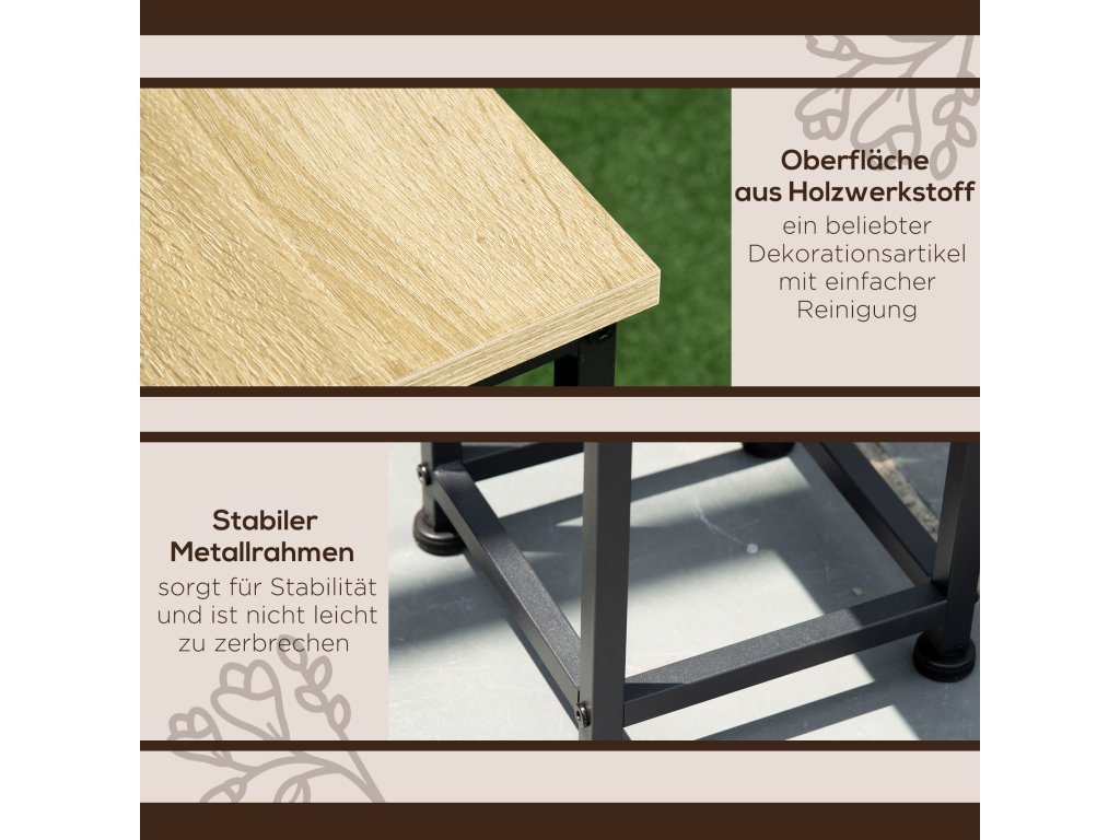 - Ocelový rám: Stojan na rostliny, jehož základem je pevný ocelový rám, zajišťuje stabilitu a je odolný proti rozbití. Na jednu jednotku unese až 30 kg. Vrchní deska z dřevotřísky umožňuje snadné čištění