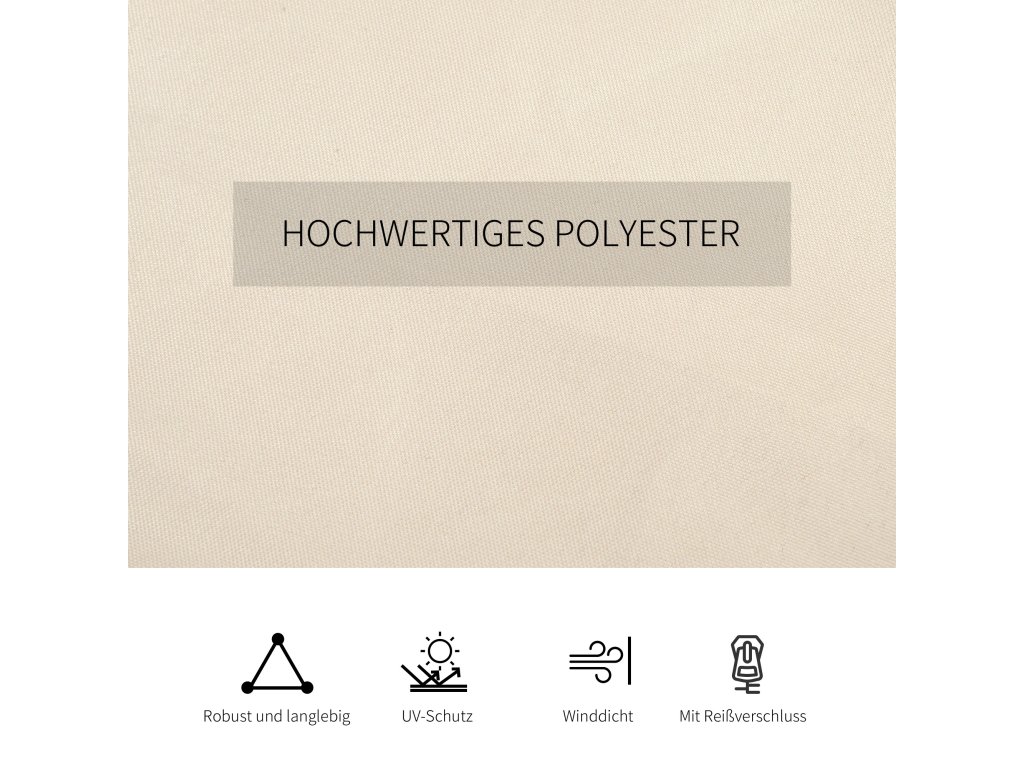 - Silný a odolný materiál: Vysoce kvalitní polyesterová tkanina je pevná a odolná a bezpečně vás ochrání před větrem a povětrnostními vlivy, když jste v altánu. Díky zipu se snadno otevírá a zavírá.