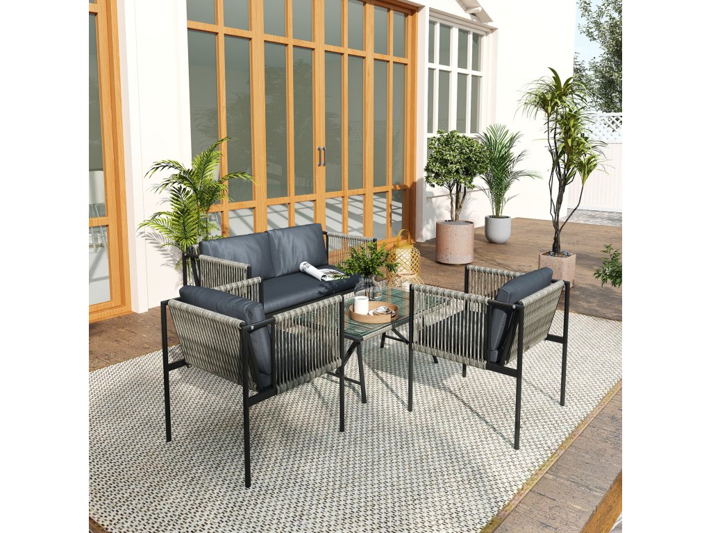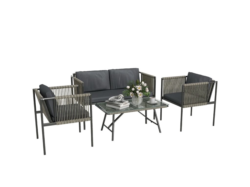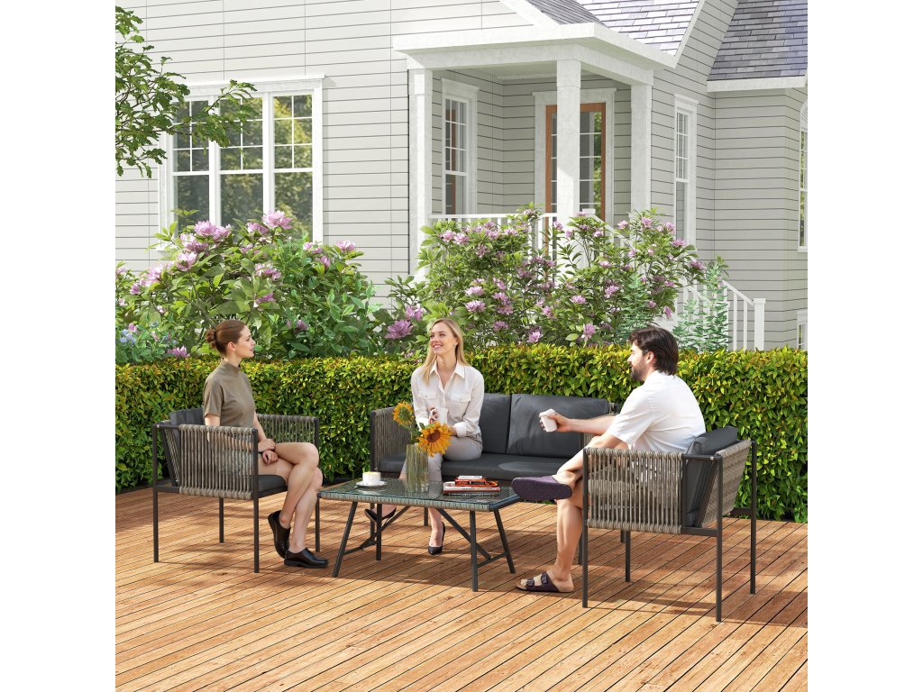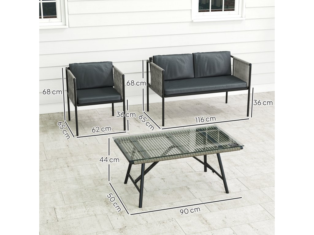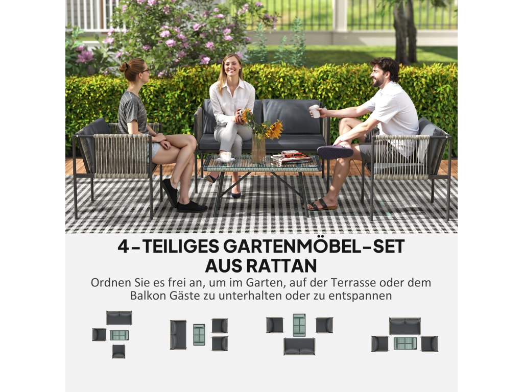 Outsunny 4dílná sada zahradního nábytku, 1 pohovka, 2 křesla, 1 stůl se skleněnou deskou, polštáře, ocelový rám, plastový ratan, šedá barva