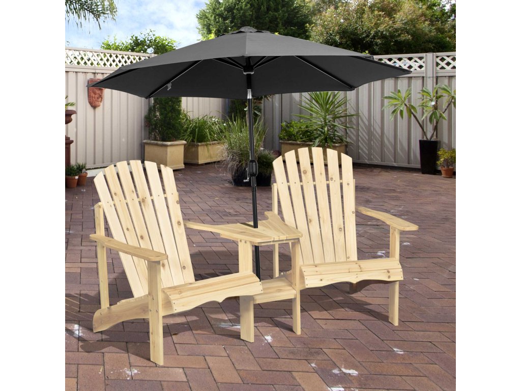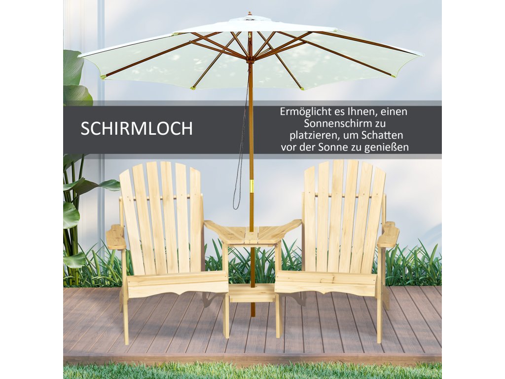 Outsunny Adirondack zahradní židle se stolem a otvorem pro slunečník 2místné zahradní křeslo sedací skupina zahradní nábytek na balkon z masivního dřeva přírodní 178 x 87 x 92 cm