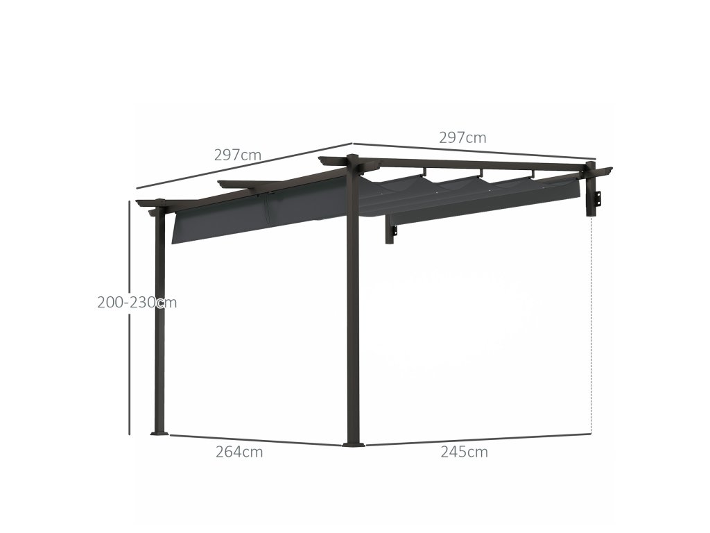 Altán Outsunny se zatahovací střechou vám nabízí venkovní ochranu před sluncem při stolování, posezení a relaxaci. Díky integrovaným otvorům v plachtě pergoly je dešťová voda okamžitě odváděna pryč a pevný, nerezavějící kovový rám pergoly je připevněn ke stěně, aby přinesl vnitřní pohodlí venku.