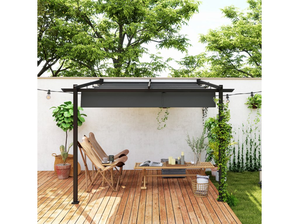 Outsunny altán, pergola 3 x 3 m, větruodolná střecha na terasu, montáž na stěnu, nastavitelná střecha, pro zahradu, terasu, tmavě šedá barva