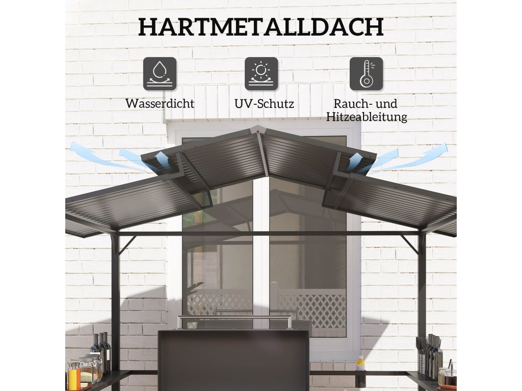 - Rozšířená ochrana proti povětrnostním vlivům: Tento grilovací altán poskytuje účinnou ochranu proti UV záření a dešti. Díky inteligentnímu ventilačnímu systému je optimálně odváděn kouř a teplo a vydrží váhu sněhu až 100 kg.