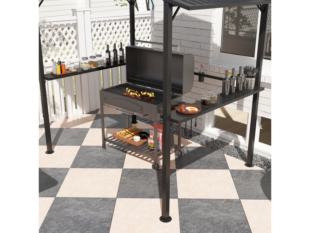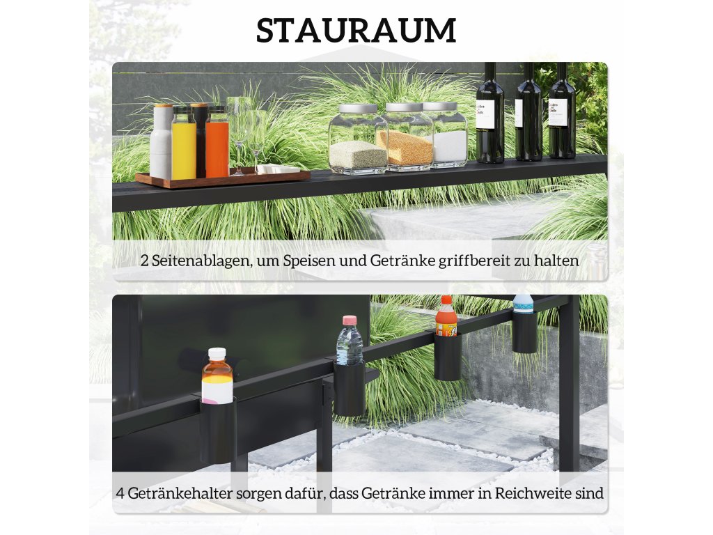 - Praktické řešení skladování: Náš grilovací altán je vybaven dvěma velkorysými policemi a čtyřmi držáky na nápoje a zaručuje, že grilovací nářadí, nápoje a potraviny budou vždy po ruce. Ideální pro udržení pořádku ve všem důležitém a pořádku na ploše!