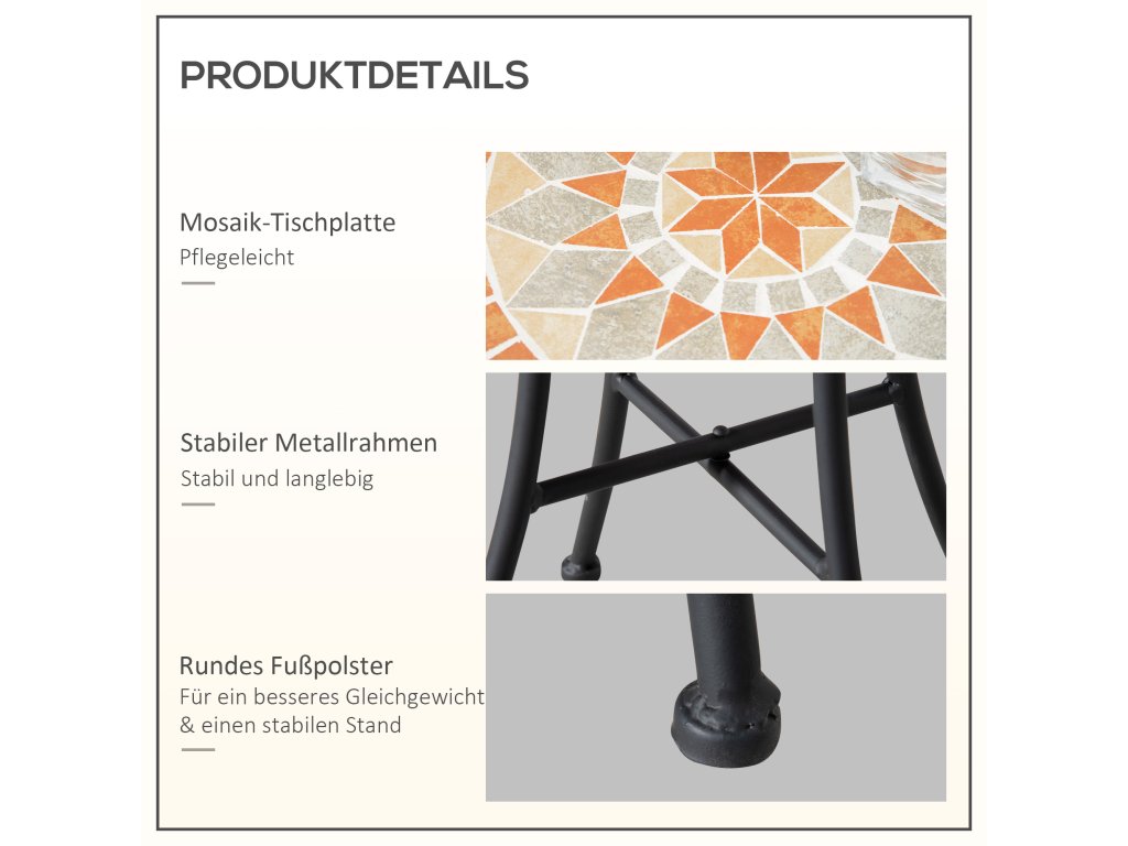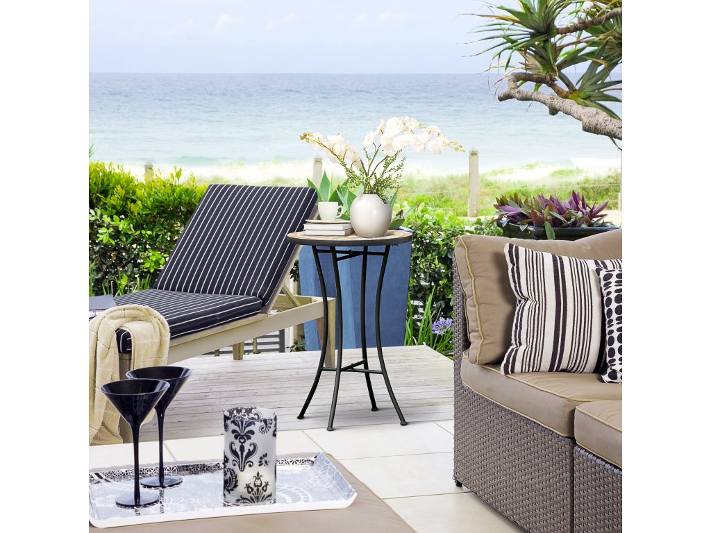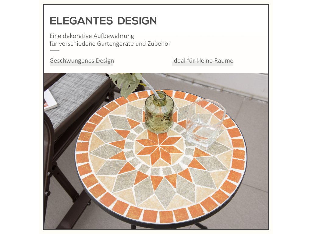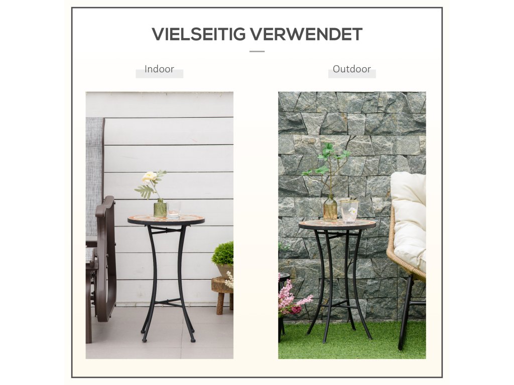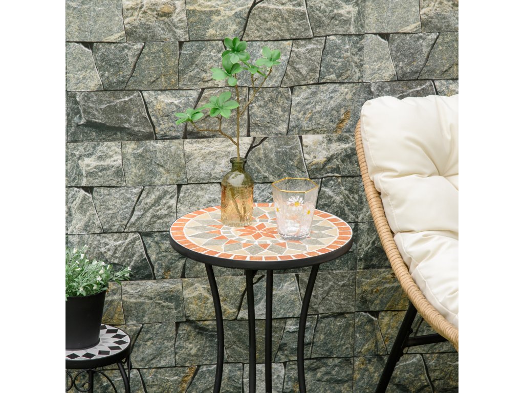Tento dekorativní stolek na terasu od společnosti Outsunny je ideální pro každého, kdo hledá sofistikovaný a zároveň praktický prvek vybavení své zahrady nebo terasy. Bistro stůl se skládá z robustního kovového rámu a charakteristické mozaikové stolové desky, která je nejen mimořádně estetická, ale také vysoce stabilní. Stolek se hodí téměř do každého prostředí a lze jej použít také jako konferenční stolek, odkládací stolek nebo pracovní stůl.