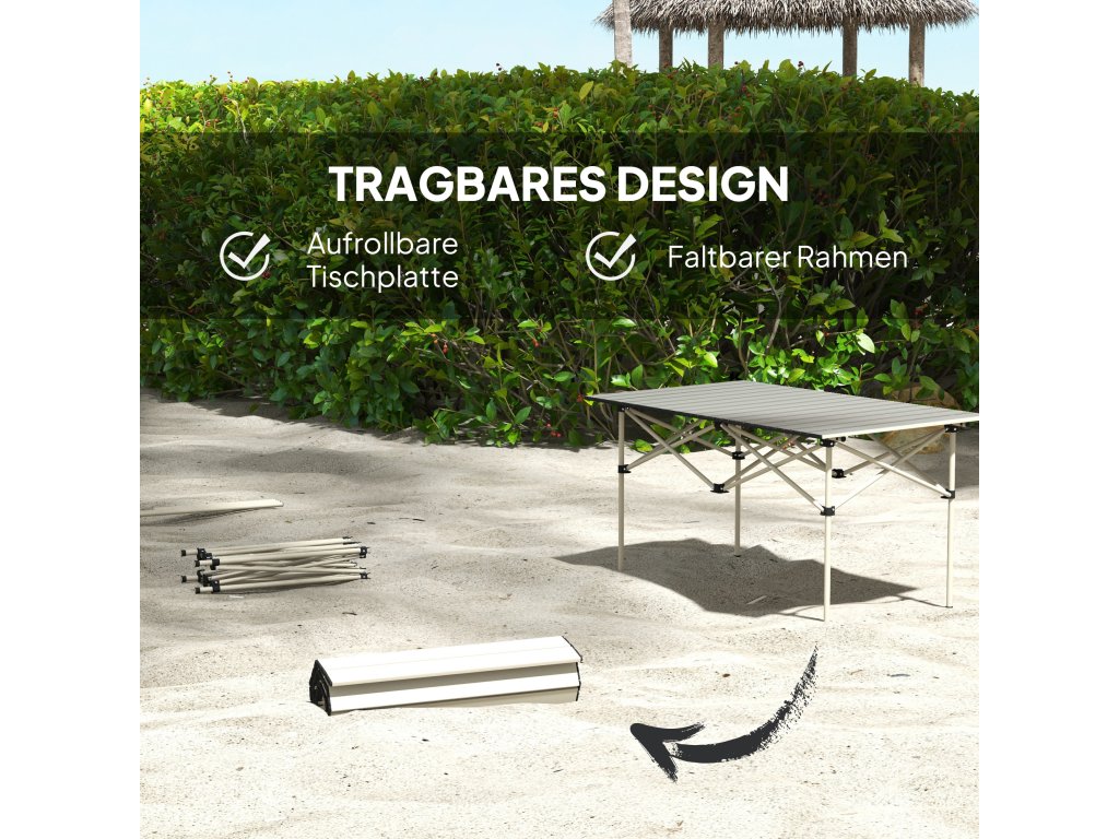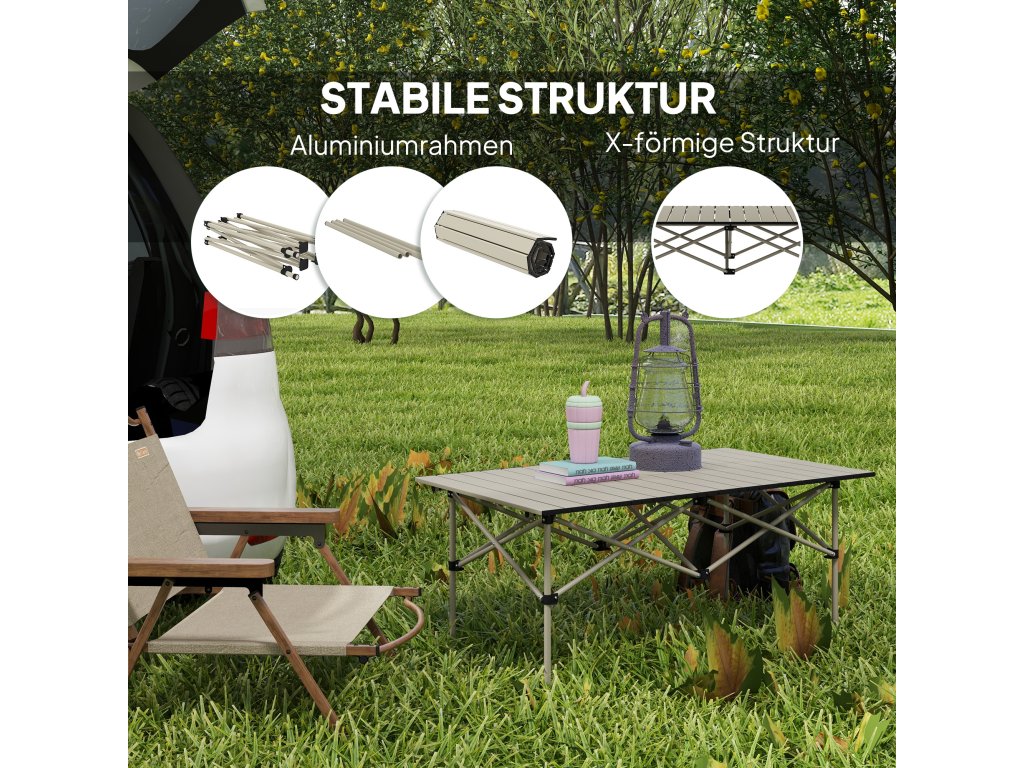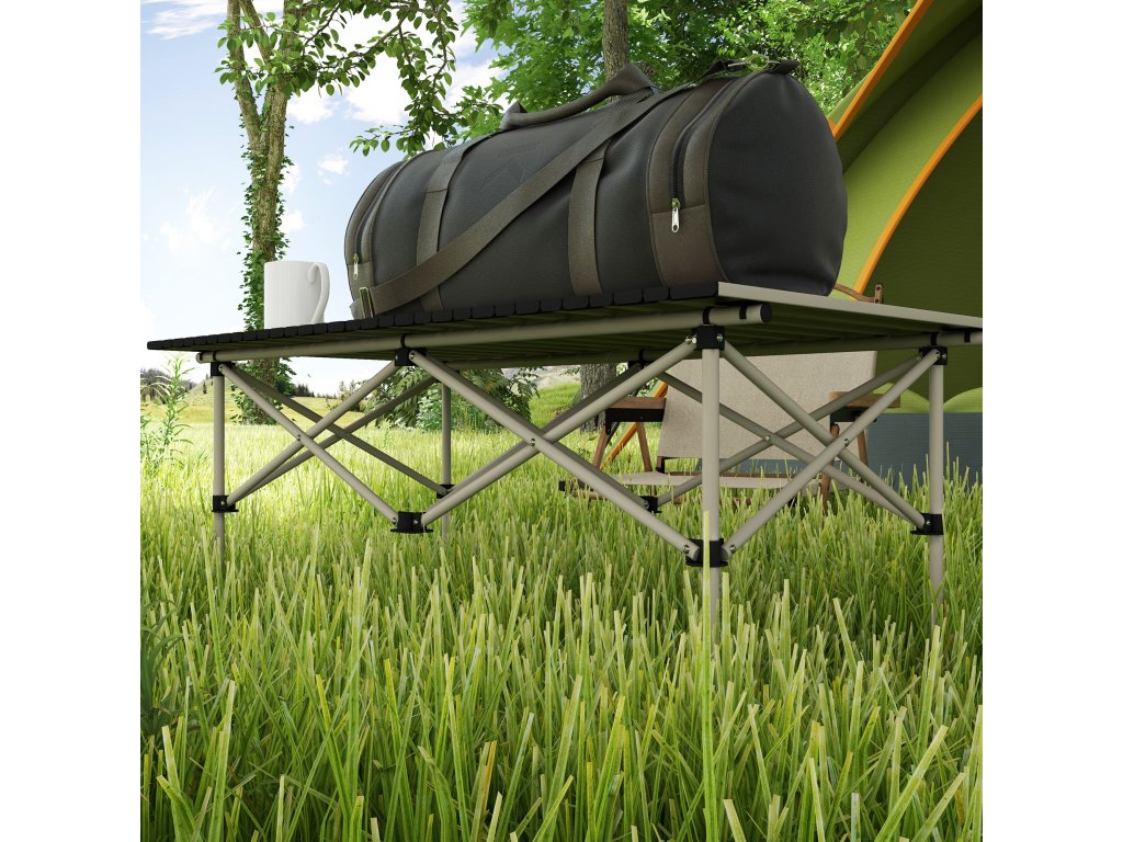- Snadno přenosná konstrukce: Tento kempingový stůl, který se skládá z rolovací desky a skládacího rámu, je ideální na cesty - perfektní pro outdoorové aktivity a dobrodružství.