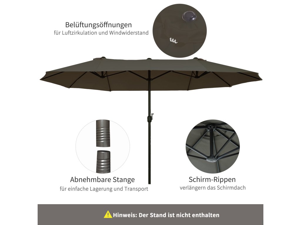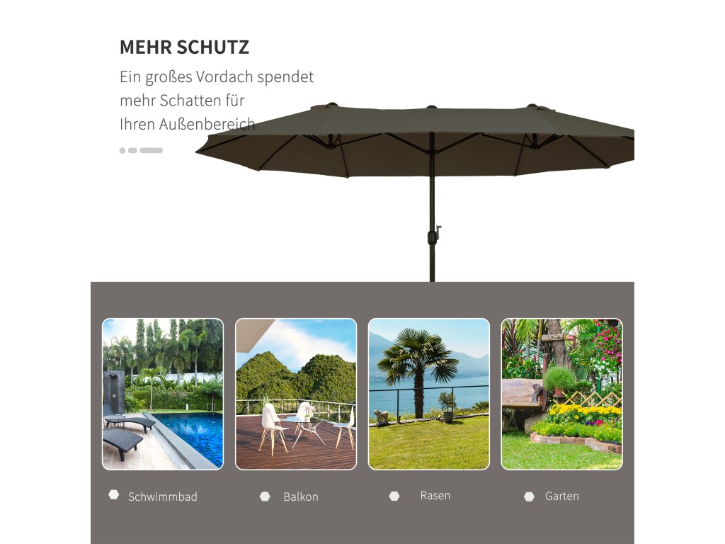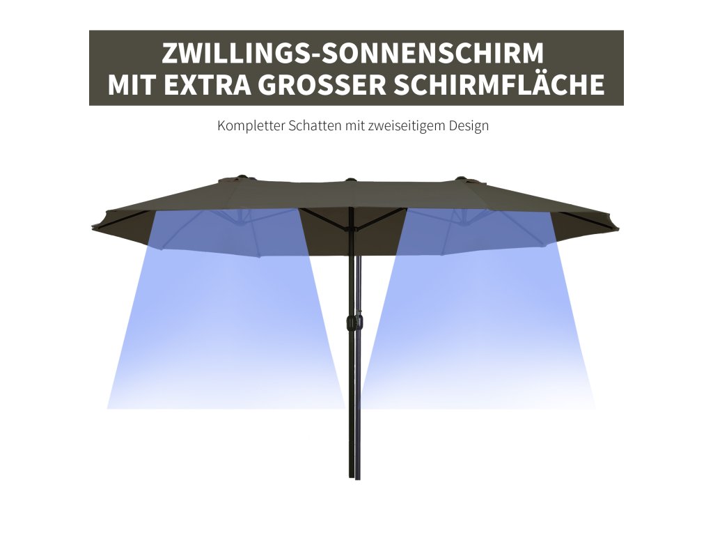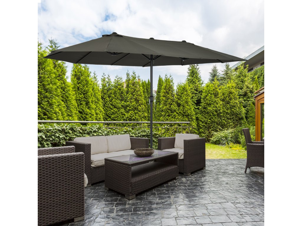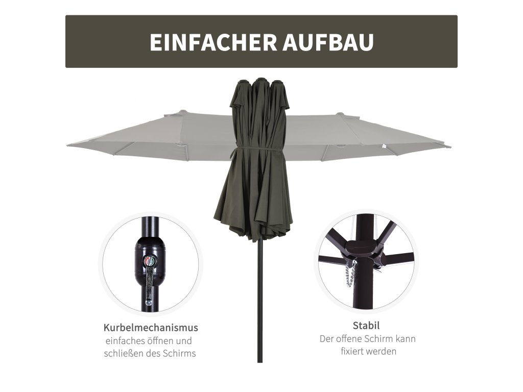 Lepší je být v bezpečí, než litovat! Náš vysoce kvalitní dvojitý slunečník od společnosti Outsunny je ideální pro každého, kdo hledá trochu více stínu v teplých dnech. Váš zahradní slunečník se bude vždy skvěle vyjímat na zahradě, terase, na pláži nebo při kempování. Otevírání a zavírání je díky přiložené ruční klice hračka. Dvanáct kvalitních kovových vzpěr zajišťuje vysokou stabilitu. Léto může začít!
