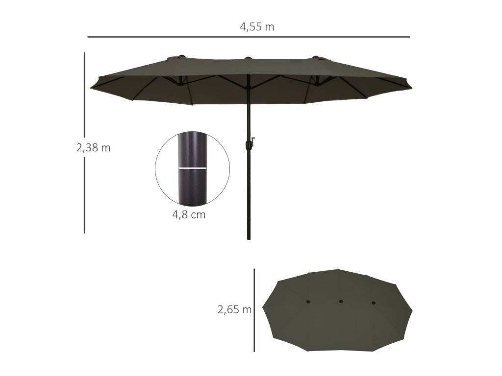 Outsunny dvojitý slunečník 455 x 265 cm, slunečník s UV ochranou a ruční klikou, balkonový slunečník plážový slunečník odolný proti větru slunečník s klikou na pláž, balkon, zahrada, šedý