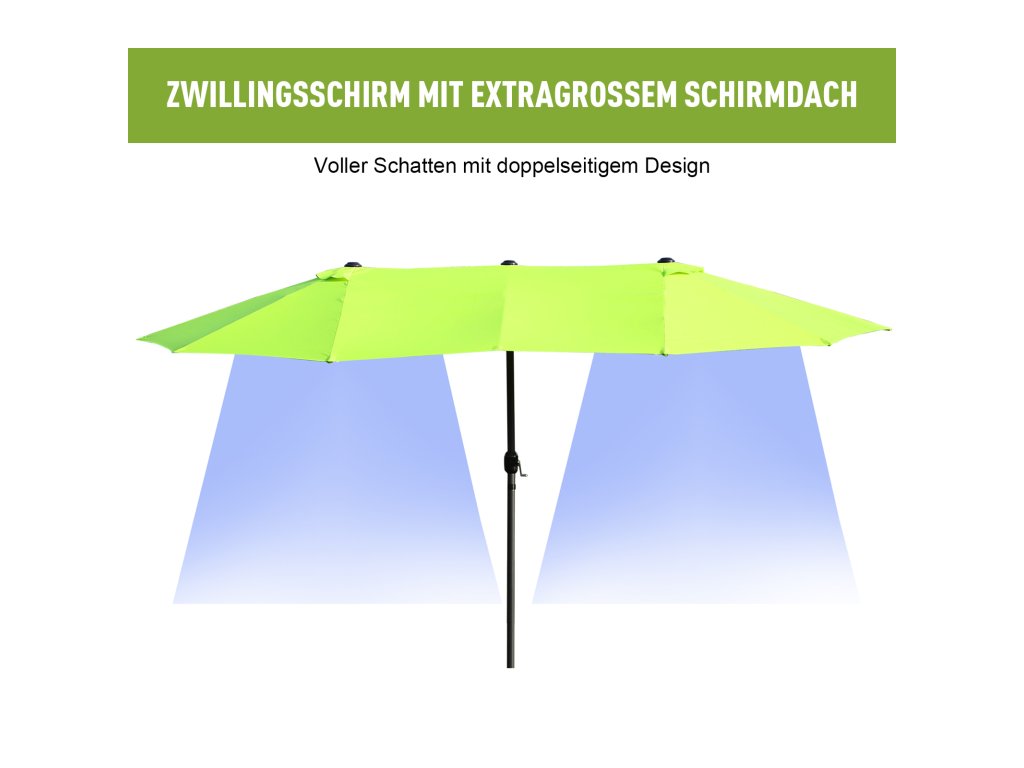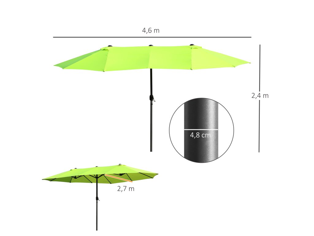 Lepší je být v bezpečí, než litovat! Náš vysoce kvalitní dvojitý slunečník od společnosti Outsunny je ideální pro každého, kdo hledá trochu více stínu v teplých dnech. Váš zahradní slunečník se bude vždy skvěle vyjímat na zahradě, na terase, na pláži nebo při kempování. Otevírání a zavírání je díky přiložené ruční klice hračka. Dvanáct kvalitních kovových vzpěr zajišťuje vysokou stabilitu. Léto může začít!