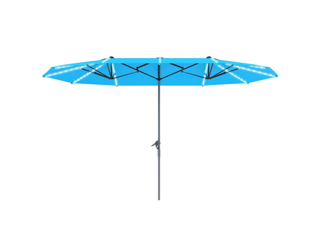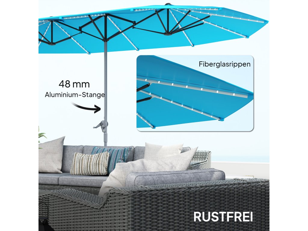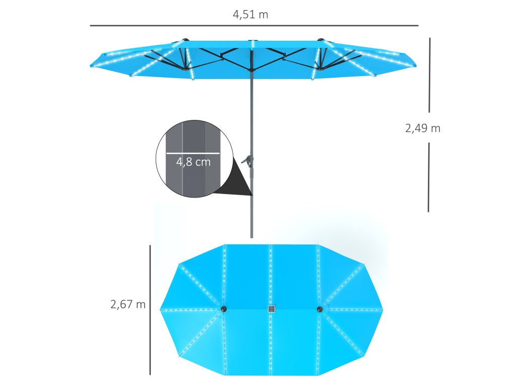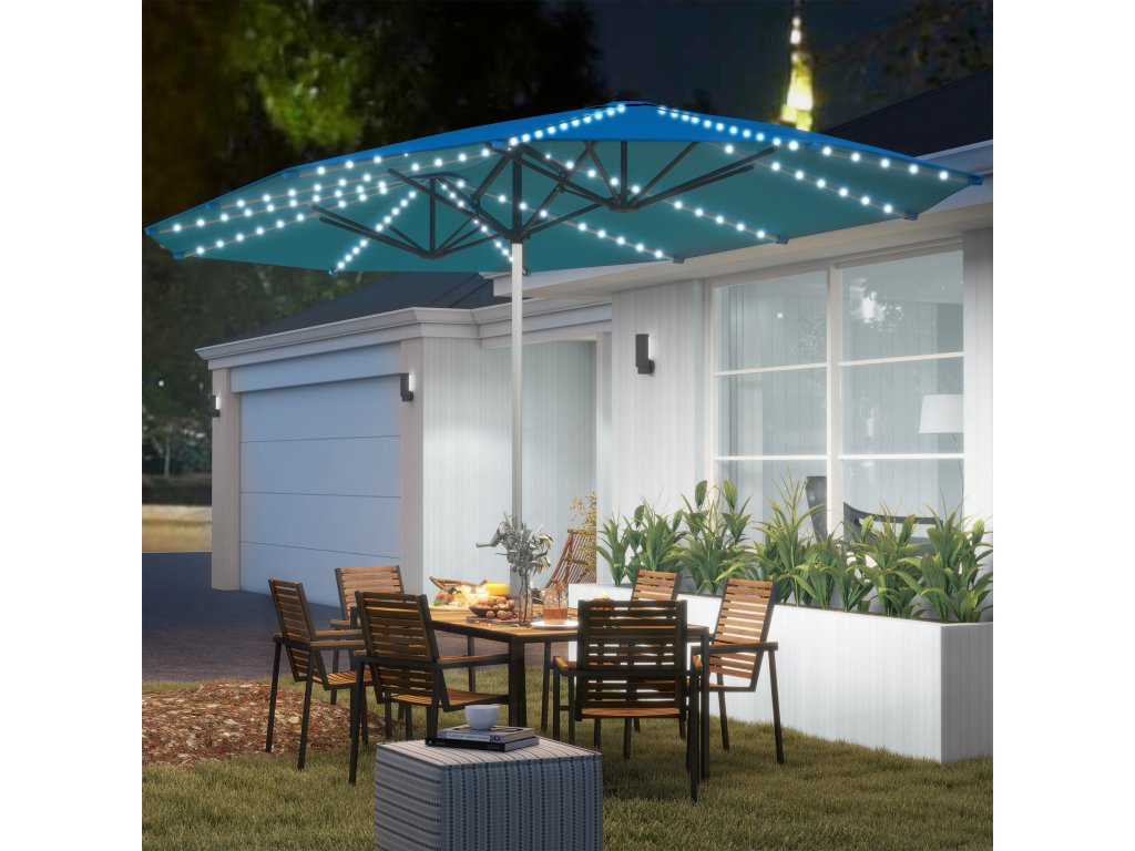 Outsunny dvojitý slunečník se solárním osvětlením, hliník, polyester, ochrana UPF50+, odolný proti UV záření, slunečník na terasu, modrý