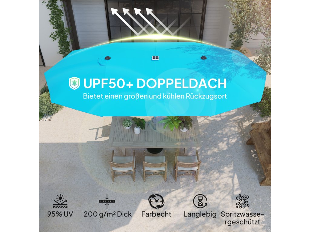 - ✔ Polyesterová tkanina dvojitého slunečníku s povrchovou úpravou UPF50+ je odolná vůči UV záření a zachovává si svou barvu