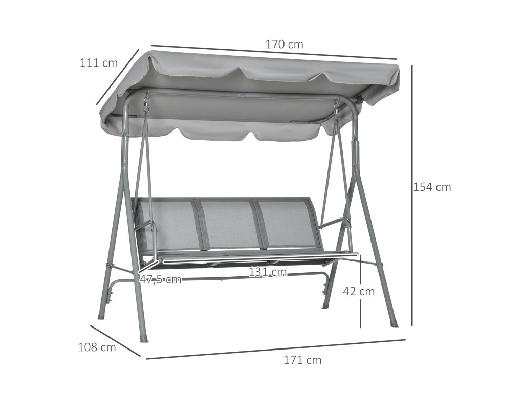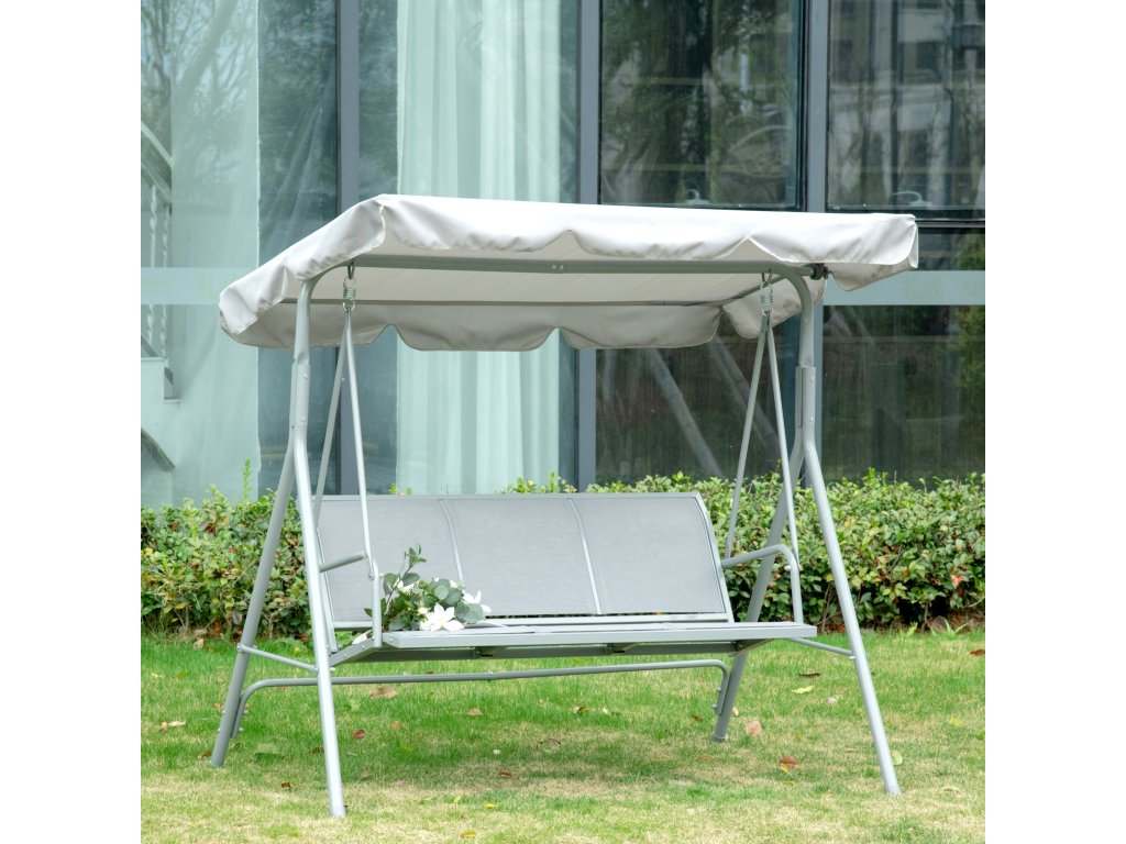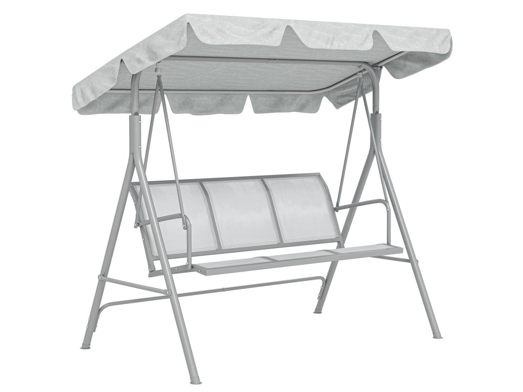 Outsunny Hollywoodská houpačka s nastavitelnou sluneční stříškou, 3místná zahradní houpačka s protiskluzovými nohami, houpací lavice, max. nosnost 240 kg, zahradní lehátko pro zahradu, terasu, 171x108x154cm, šedá barva