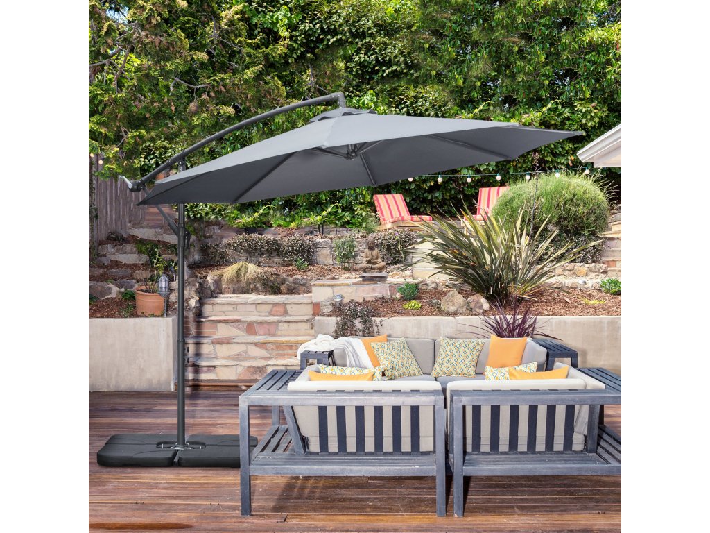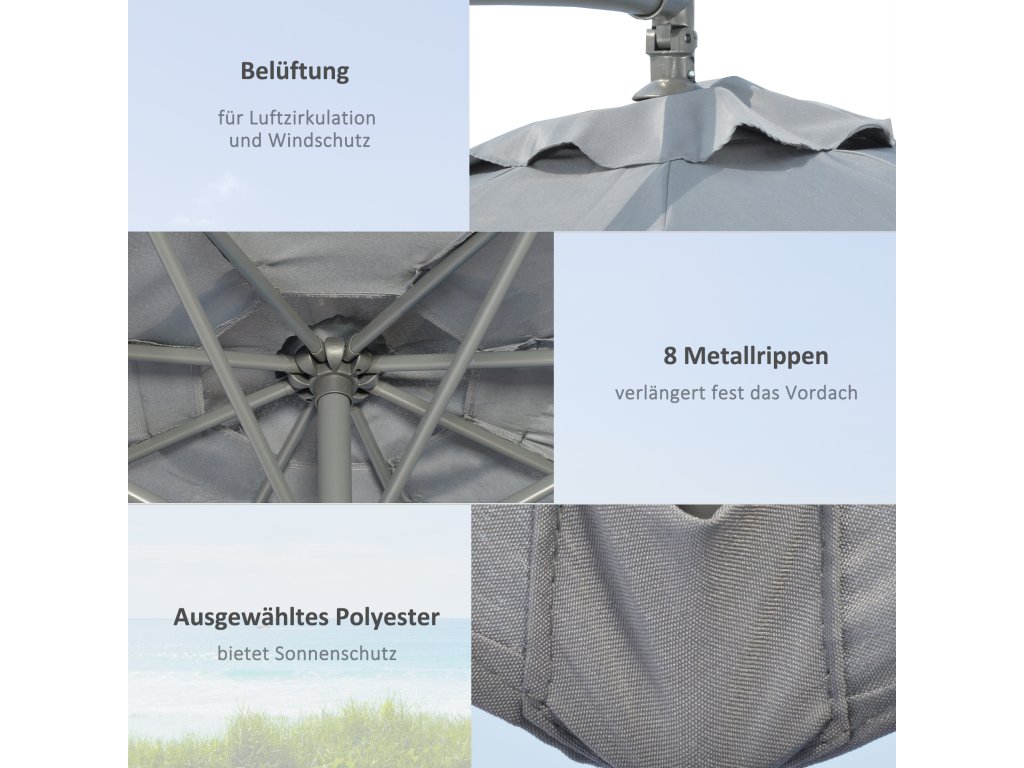 - Robustní konstrukce: Hliníková tyč slunečníku a osm práškově lakovaných ocelových vzpěr jsou chráněny proti korozi a odlupování a zajišťují konzolovému slunečníku stabilitu a dlouhou životnost