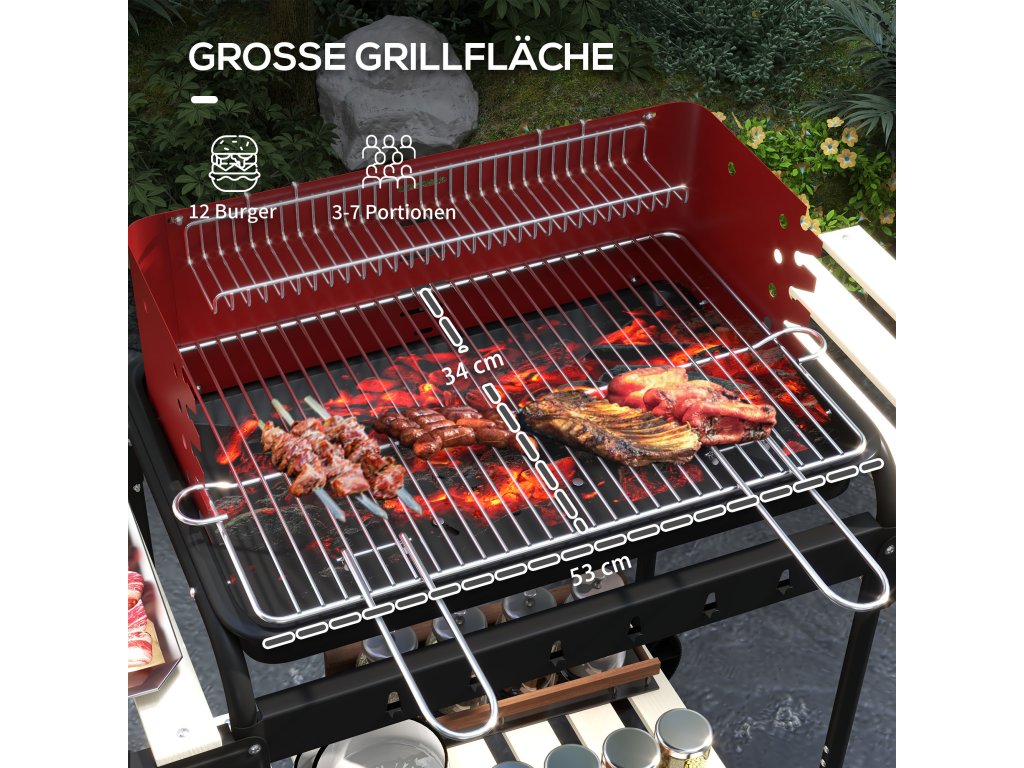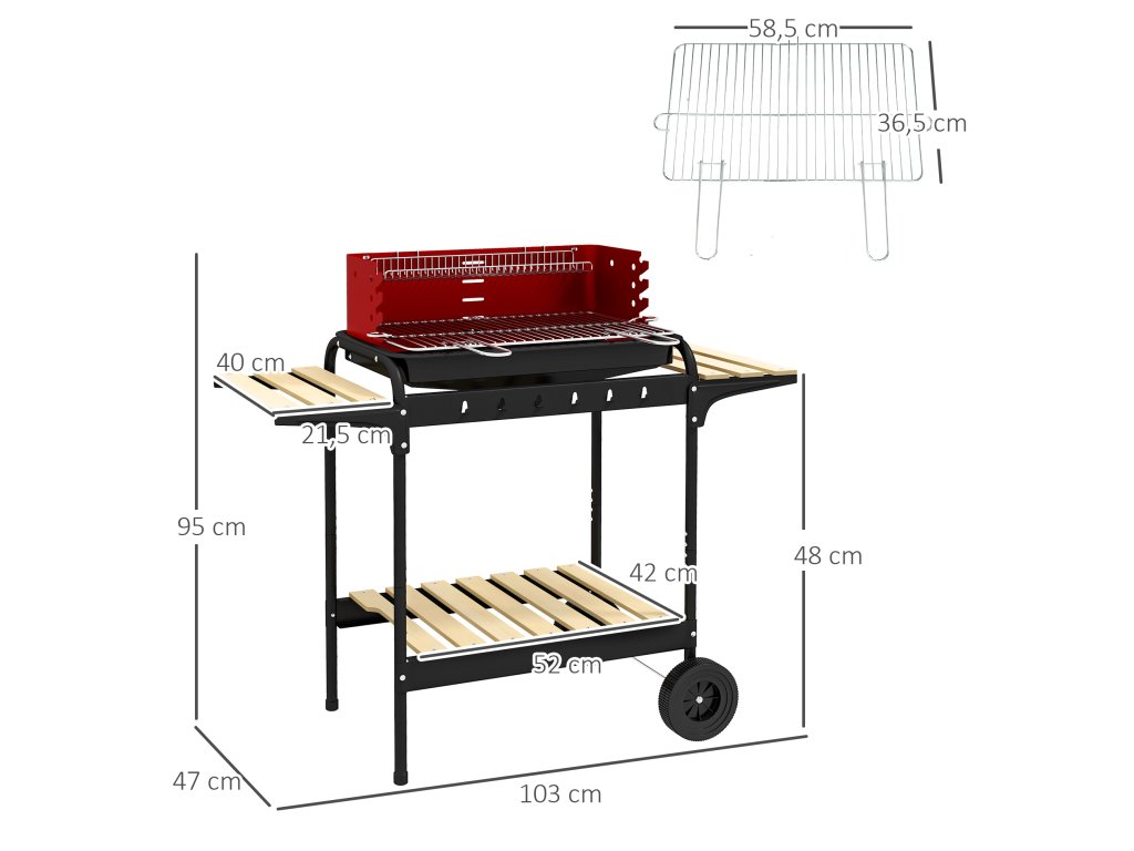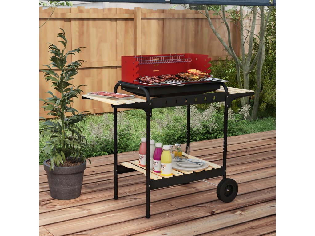 Outsunny kovový gril na dřevěné uhlí, výškově nastavitelný grilovací rošt, dřevěná police, pojízdný 103x47x95 cm